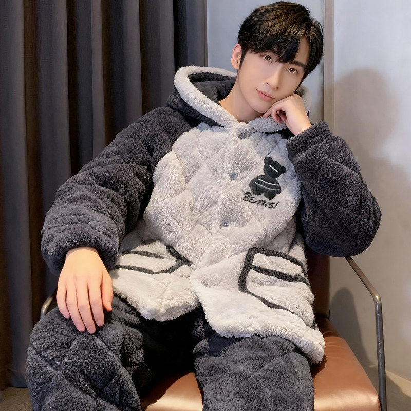 男士睡衣冬季珊瑚绒三层夹棉加厚加绒男款青少年2025年新款家居服