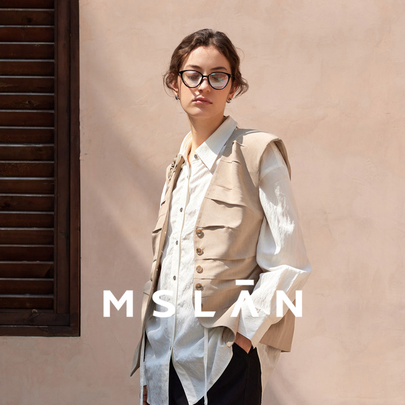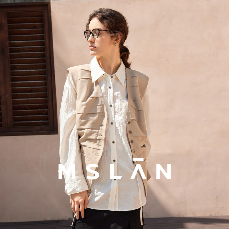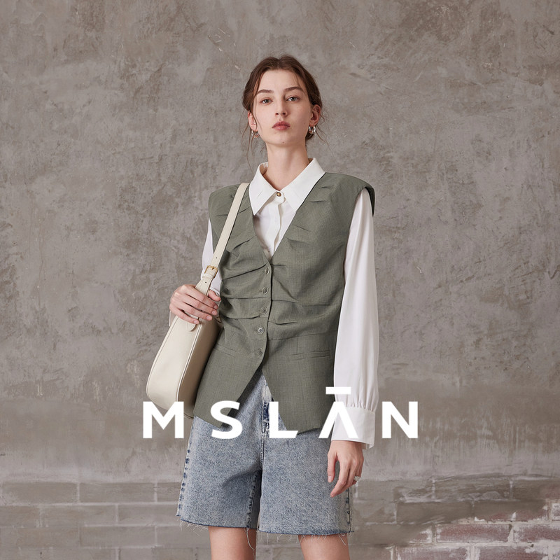 MSLAN春季复古V领设计感不规则褶皱收腰无袖马甲女MFCW009
