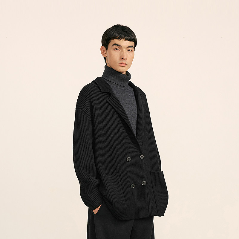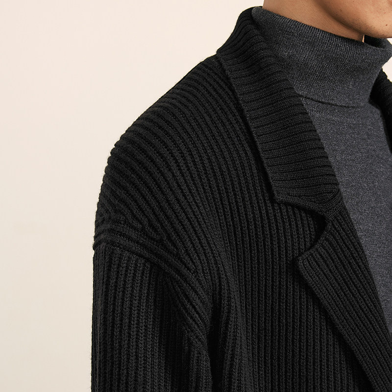 速写男装春秋新款开襟毛衫绵羊毛翻领西装领外套宽松简约优雅松弛
