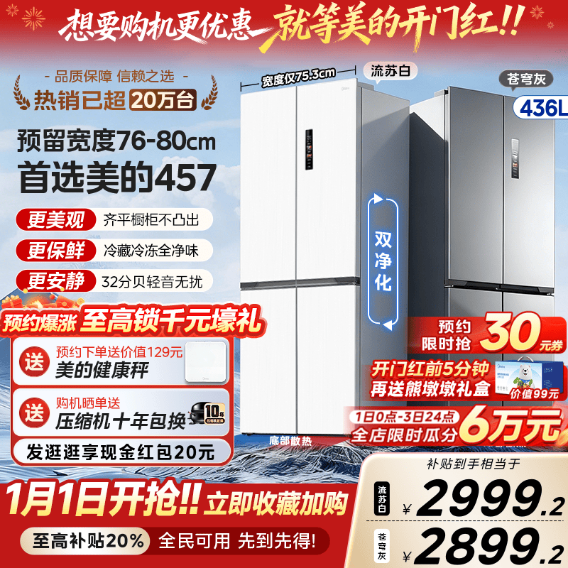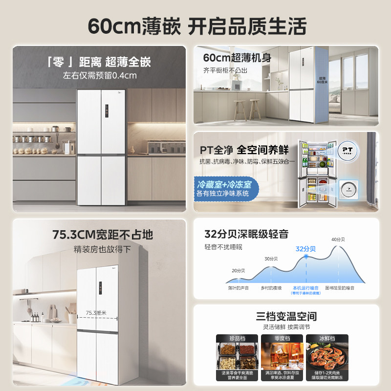 美的457超薄零嵌入式十字双开四门电冰箱家用小户型风冷无霜一级