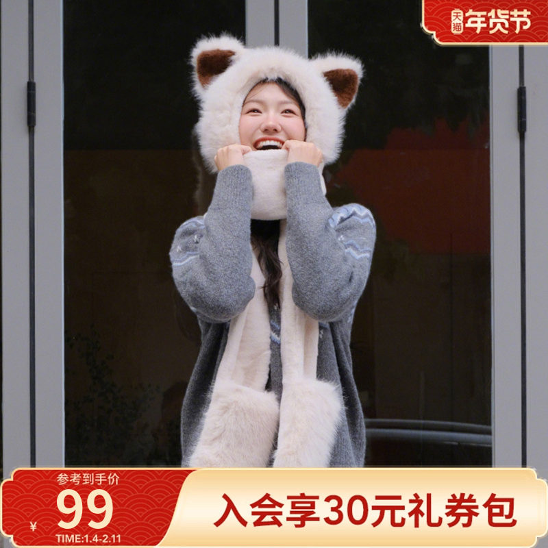 热风2025年冬季新款女士可爱耳朵三合一围巾