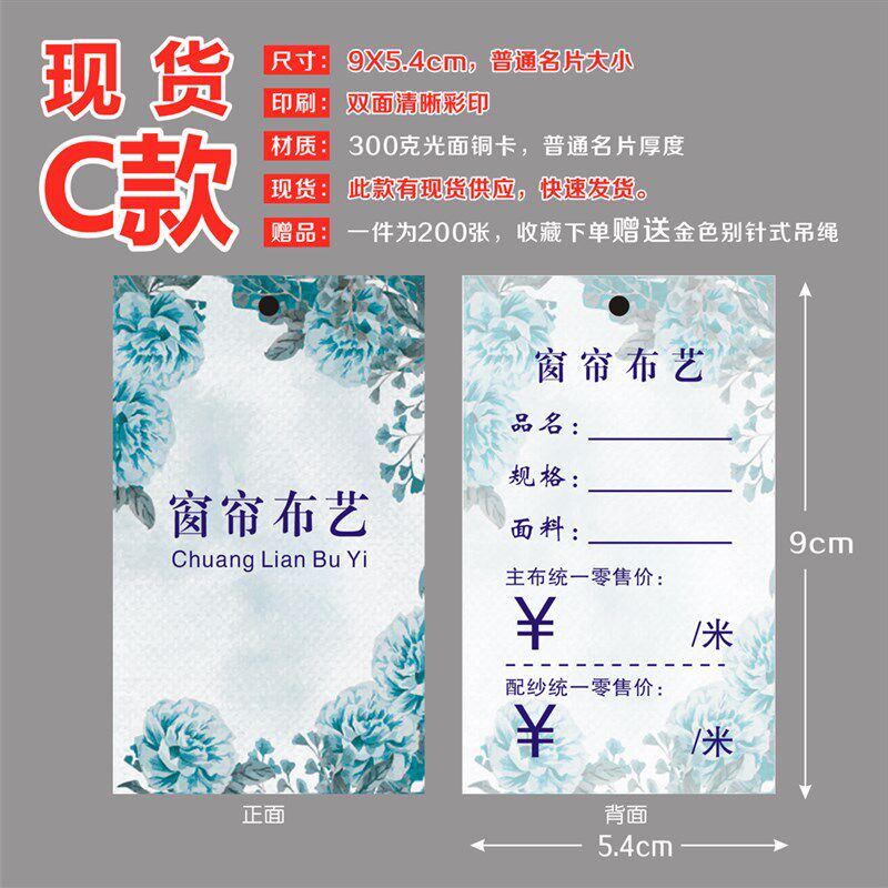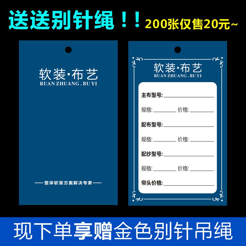 窗帘吊牌定做高档 窗帘吊牌标价签 E布艺挂牌定做送别针吊绳200张