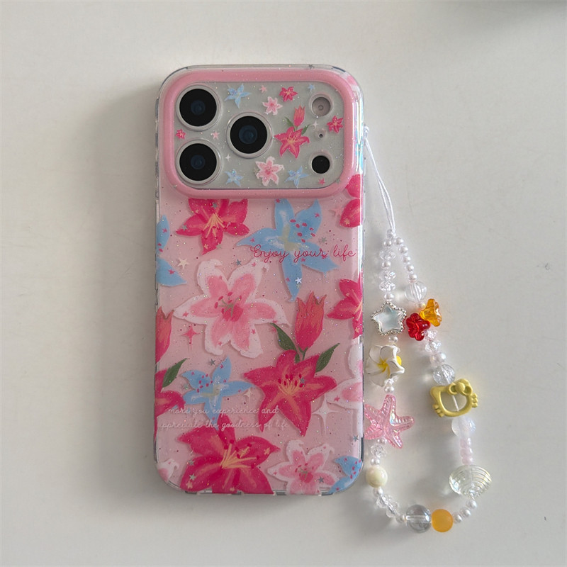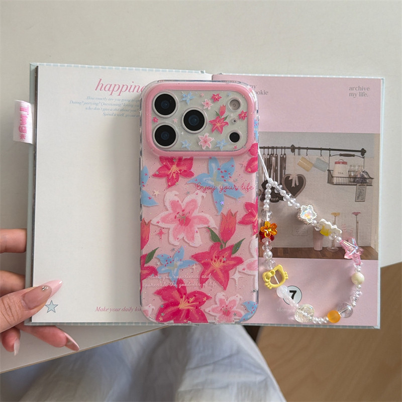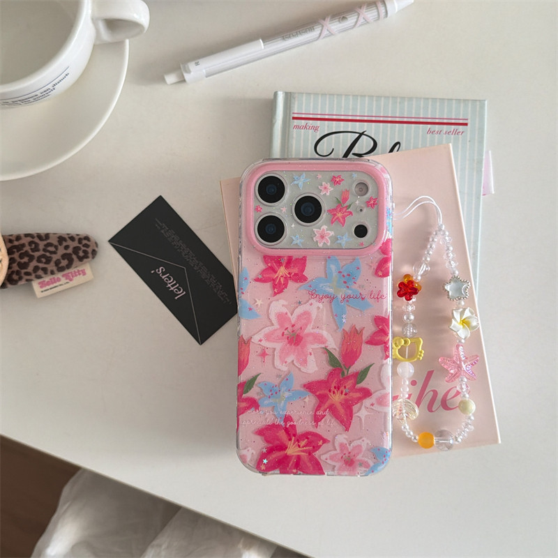 春日限定ins小清新粉蓝百合花手链17promax适用iphone16pro双层硬壳细闪14手机壳苹果15pro防摔少女心甜美13