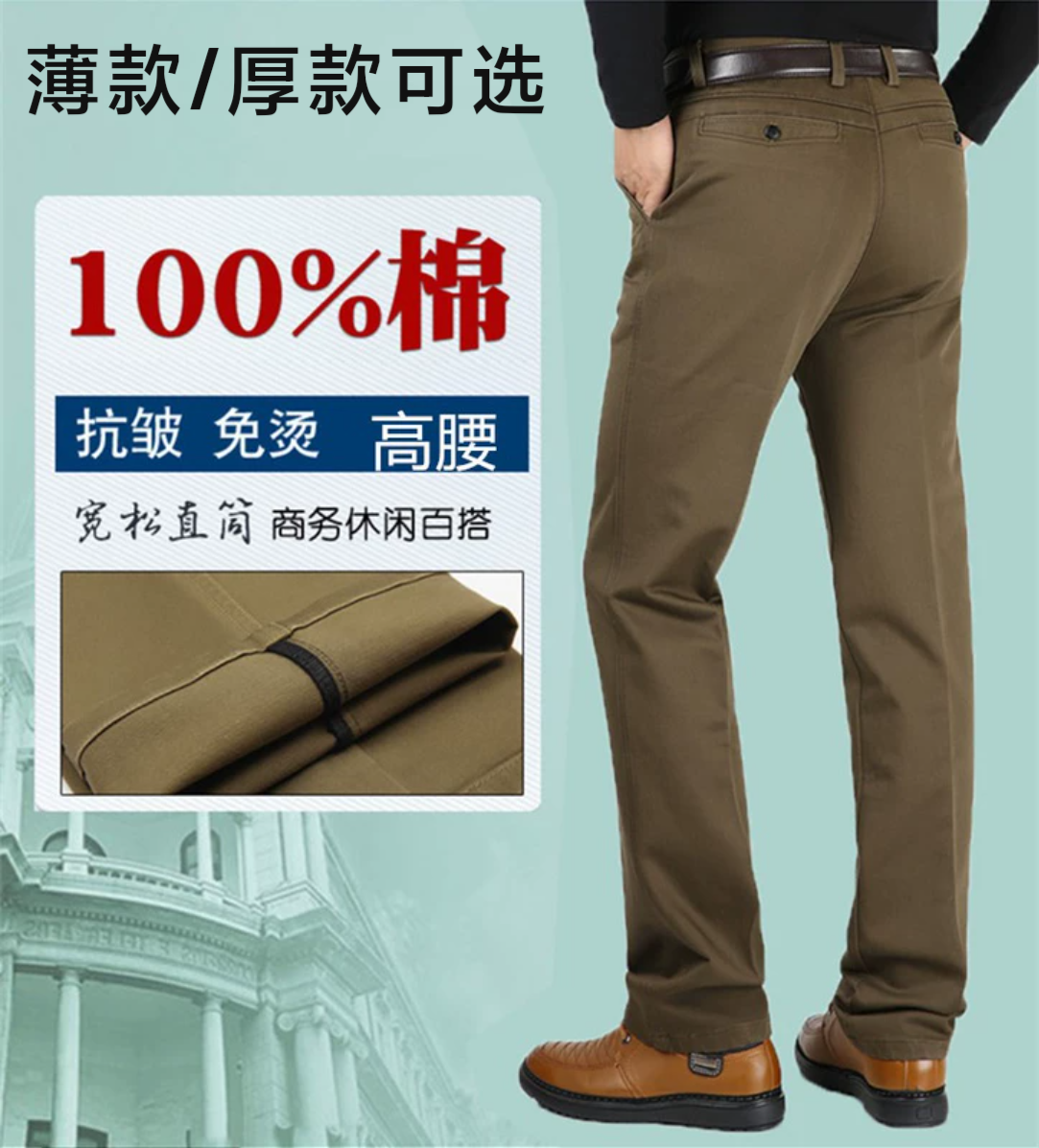 全棉纯棉免烫秋冬厚款休闲裤男高腰宽松中老年男直筒裤爸爸装长裤