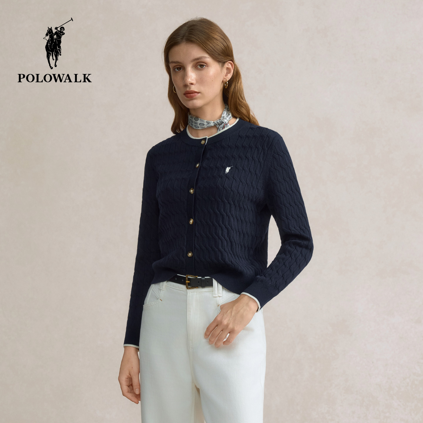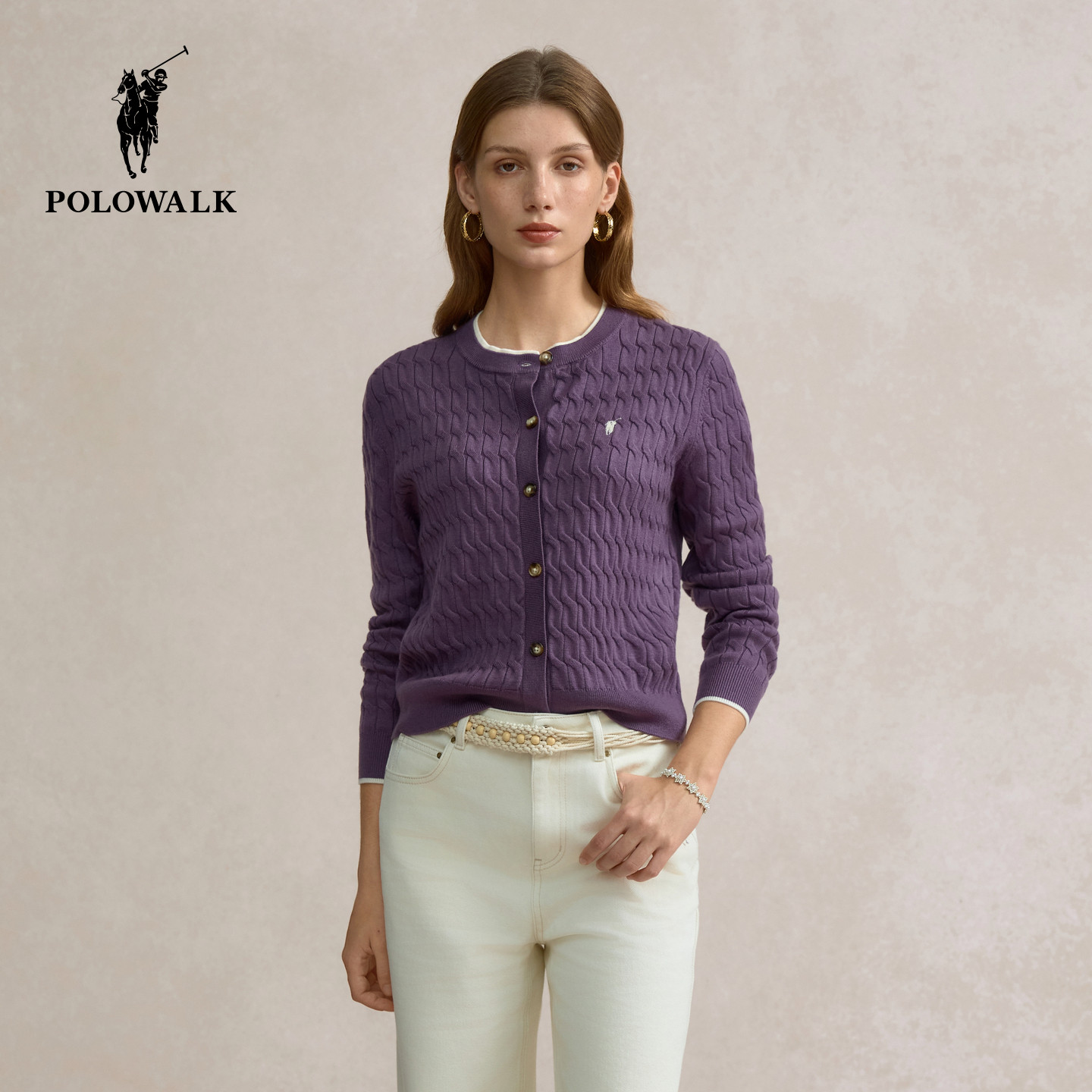 【特惠】POLOWALK女士长袖针织衫春季毛衣绞花外套开衫女装上衣