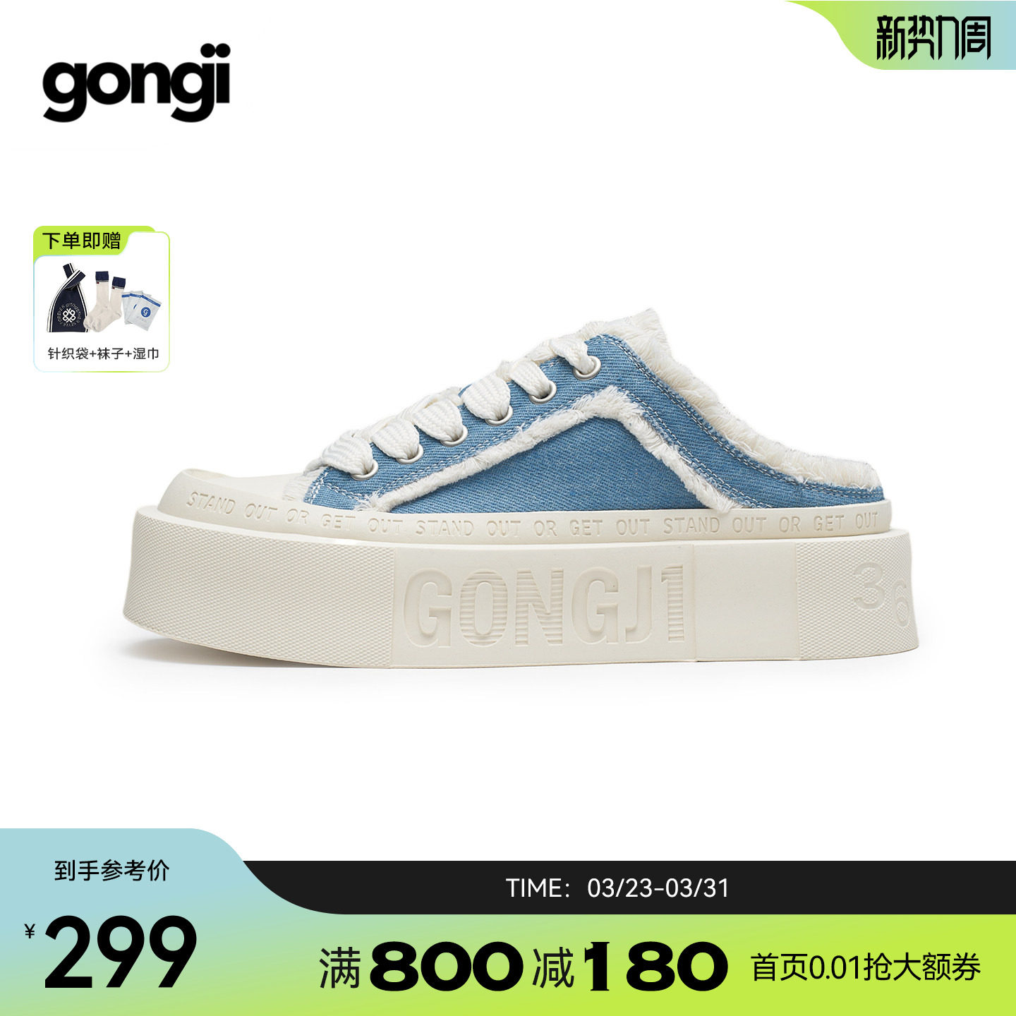 GONGJI包头半拖鞋女外穿春夏新款无后跟帆布鞋厚底一脚蹬懒人鞋