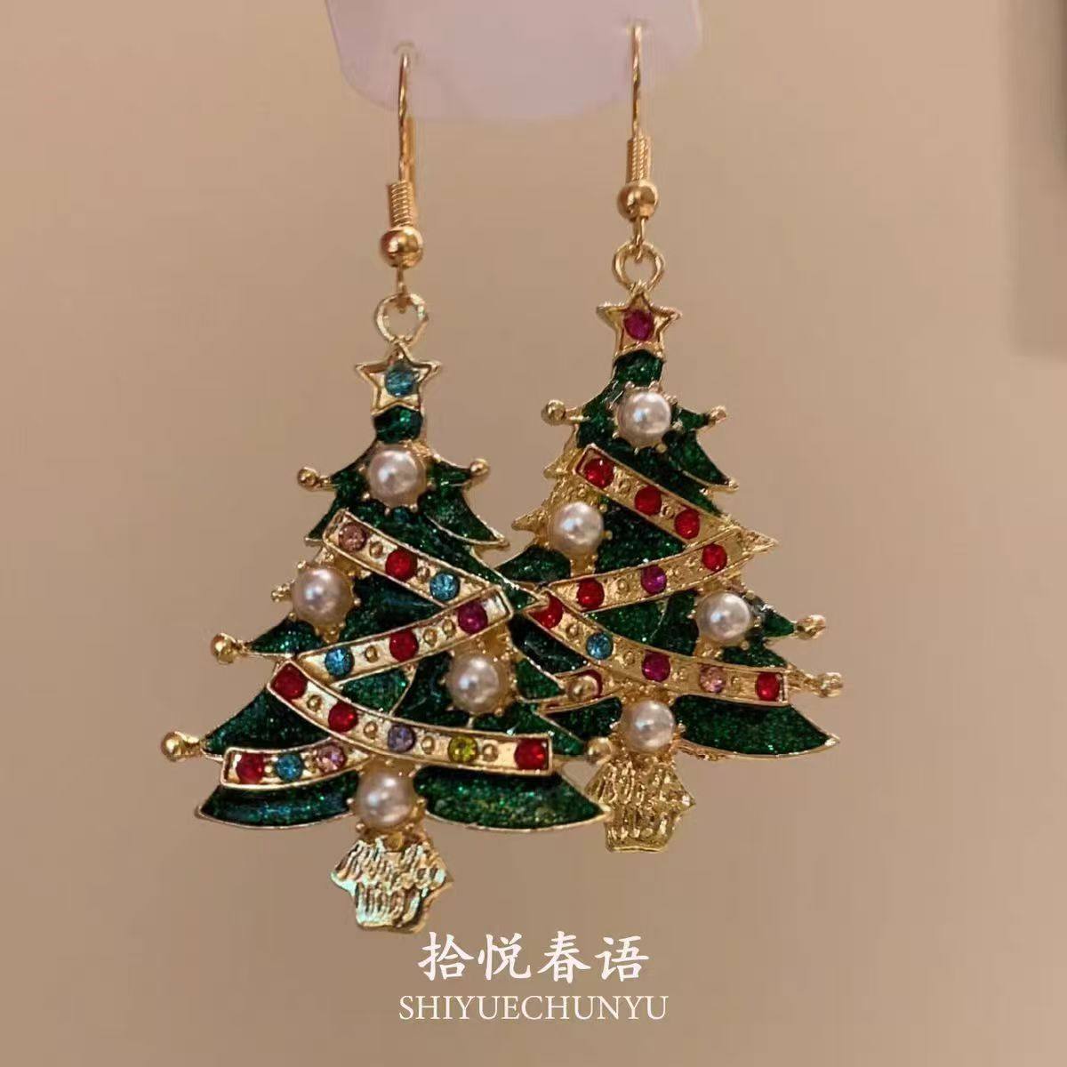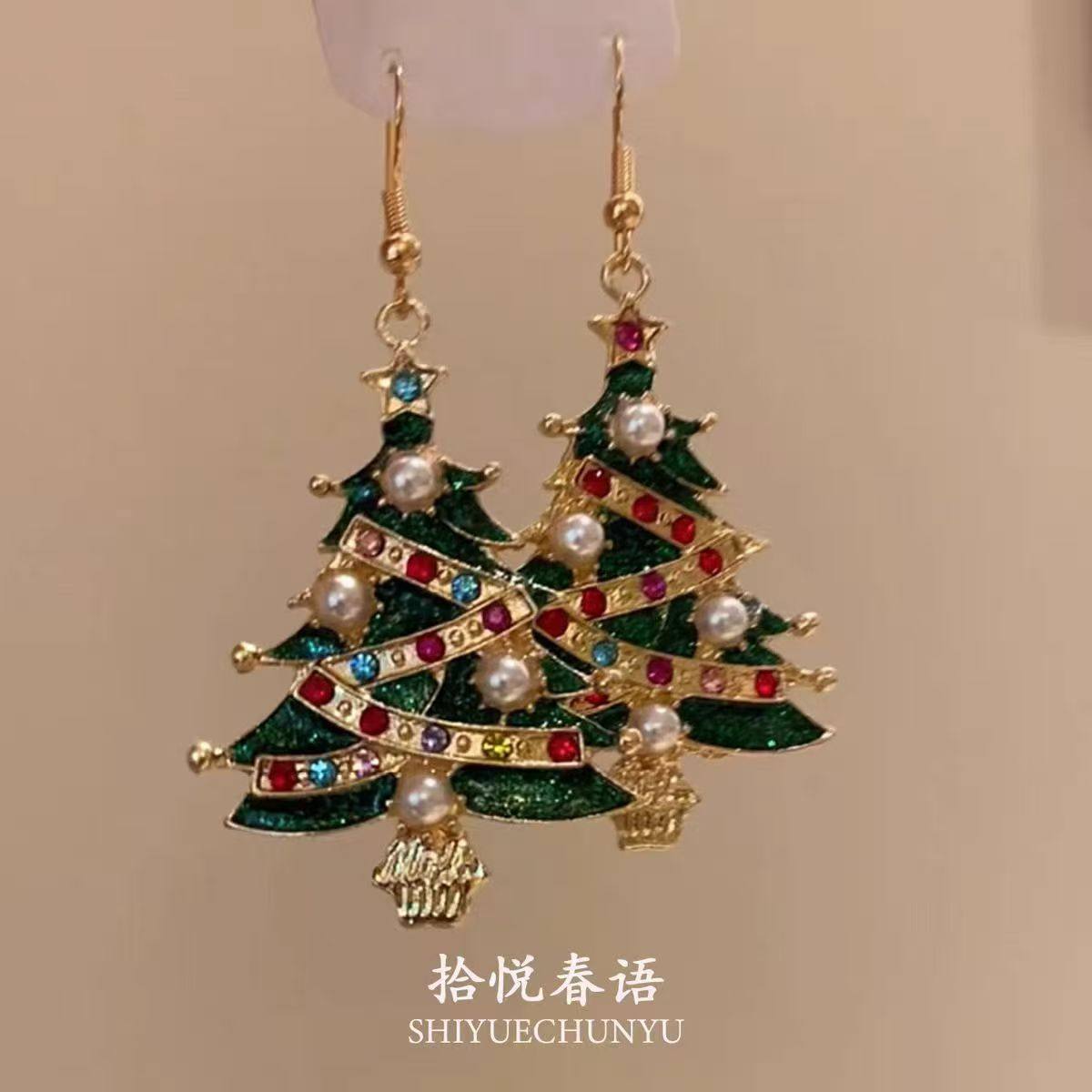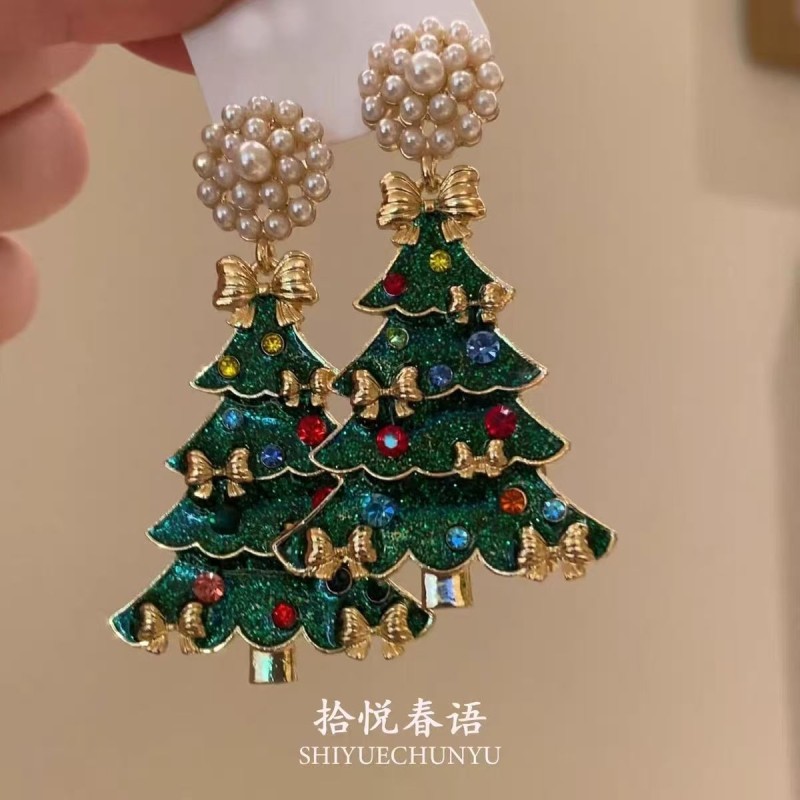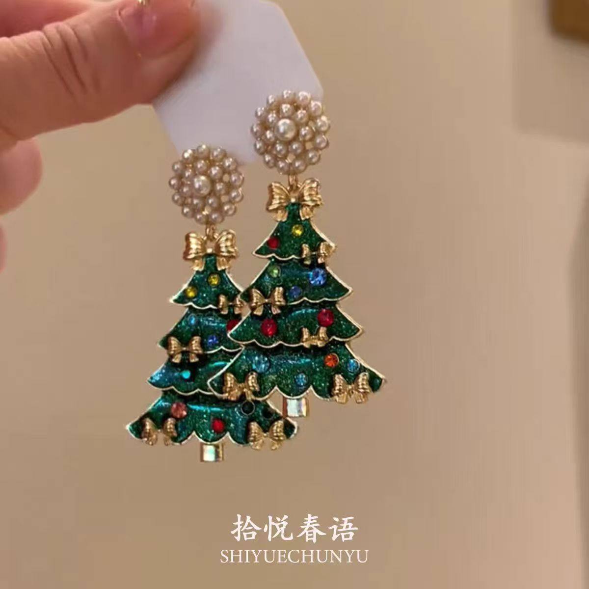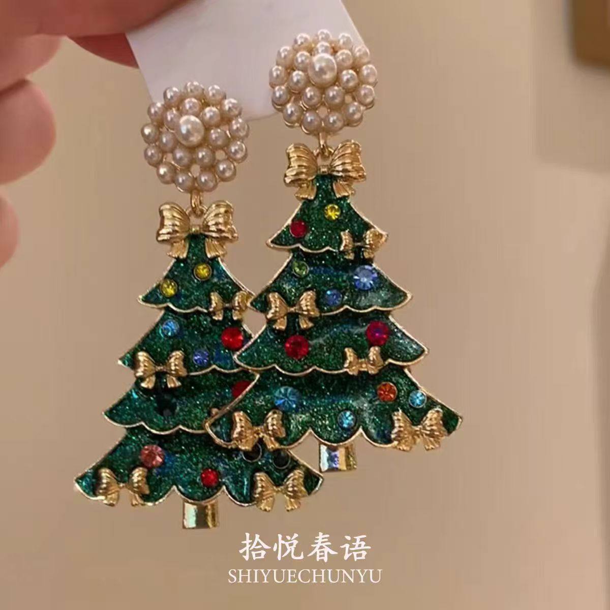 「暖冬物语」爆闪彩色锆石圣诞树珍珠耳钉多巴胺氛围感气质耳饰女