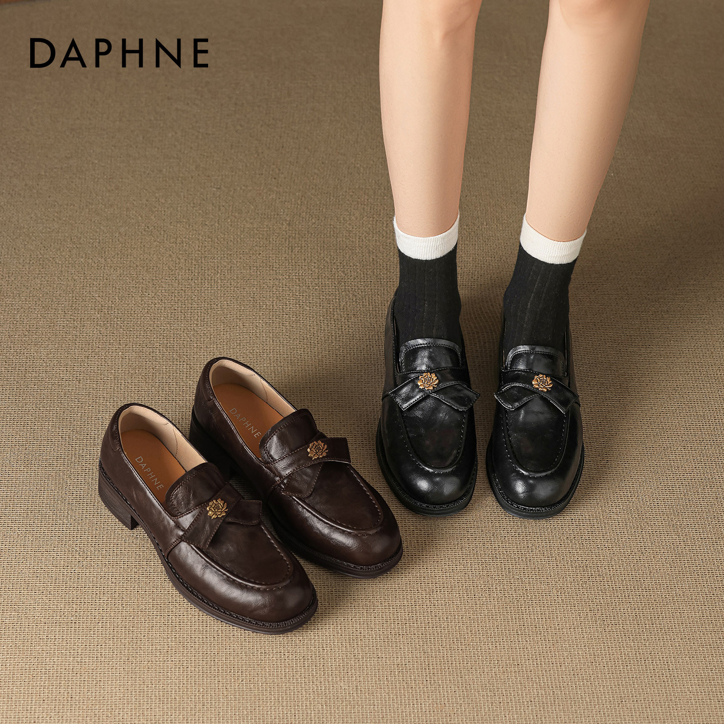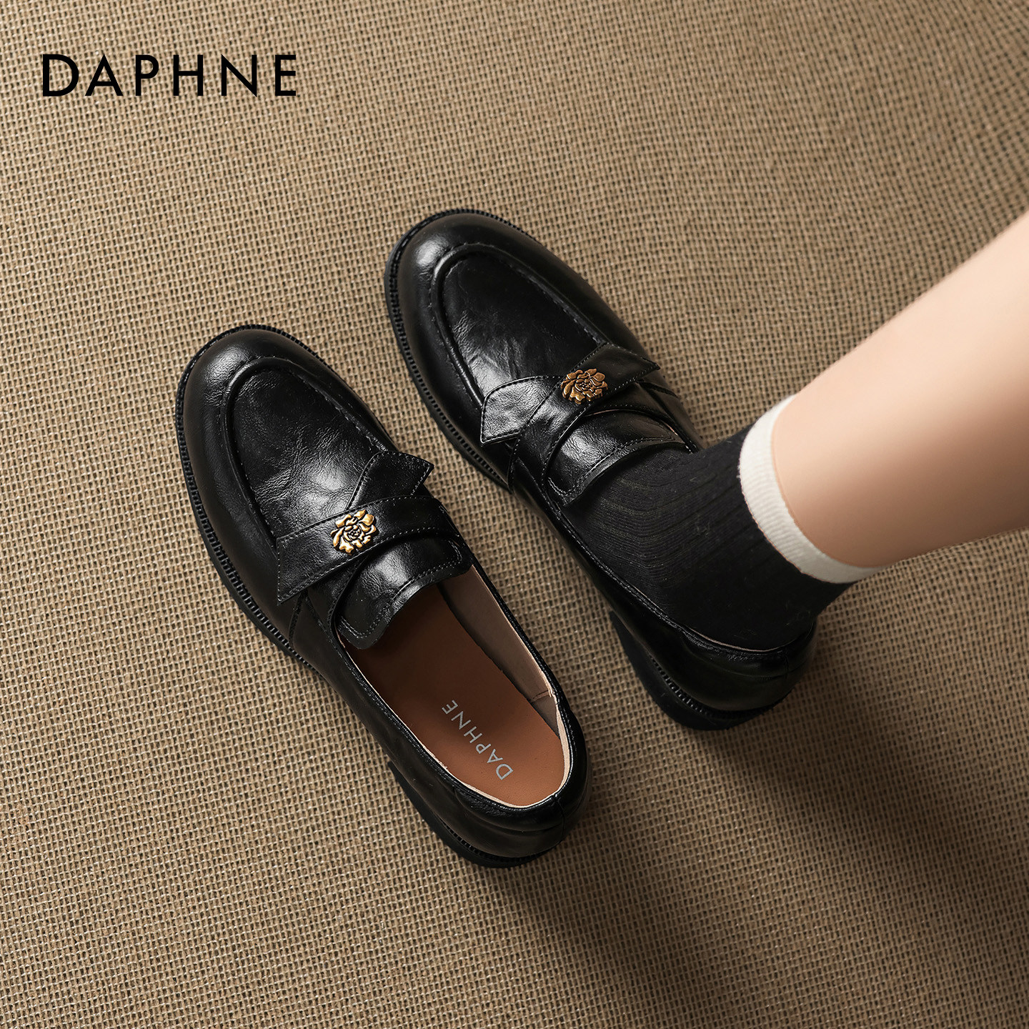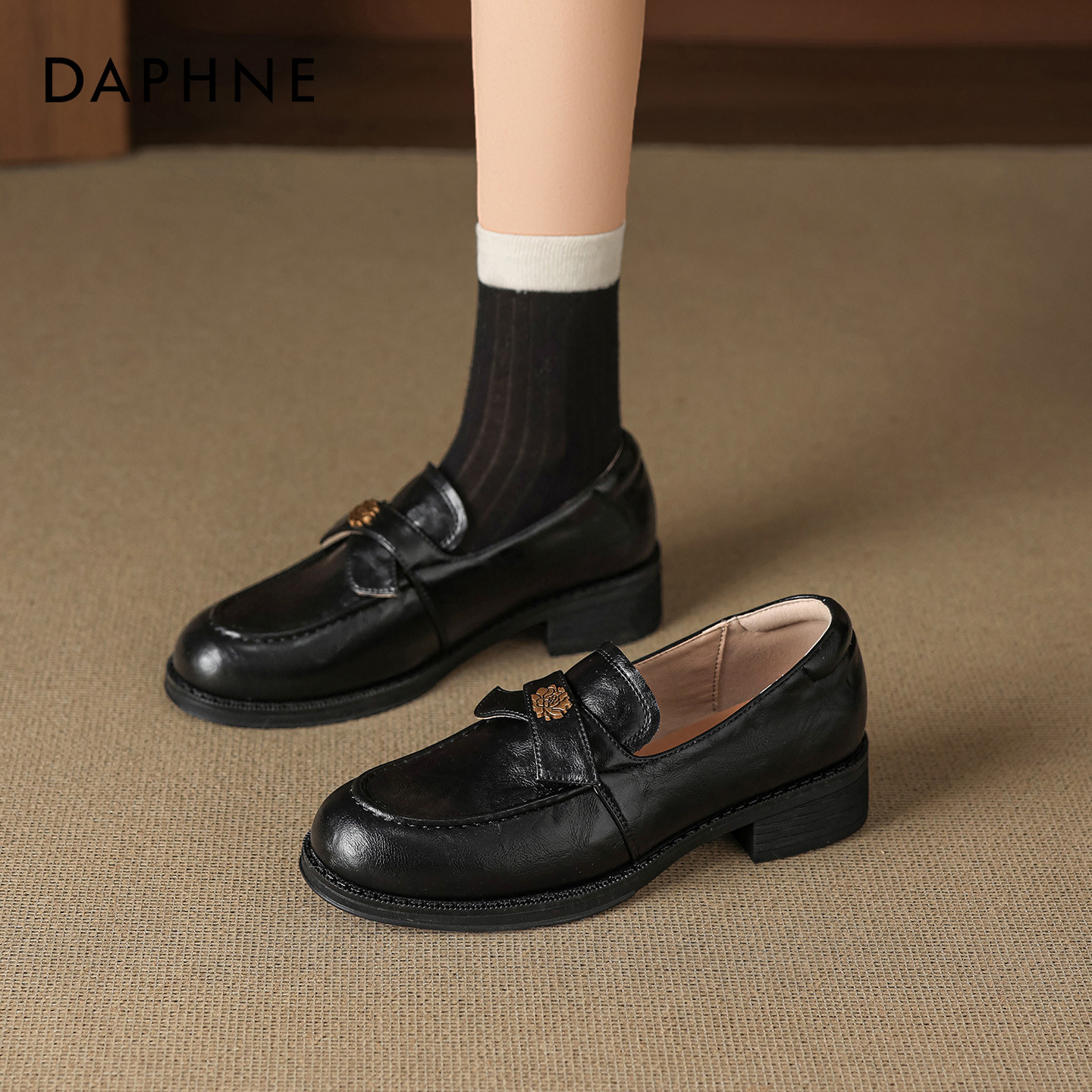 达芙妮黑色乐福鞋女2026新款春季英伦风一脚蹬通勤单鞋浅口小皮鞋