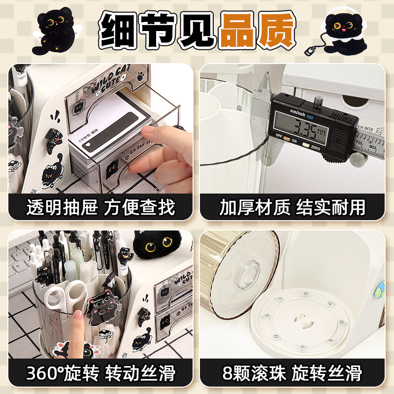 萌趣熊猫!旋转笔筒收纳盒儿童学生多功能一体抽屉式笔桶创意高颜值男孩女孩书桌置物架桌面大容量文具收纳盒