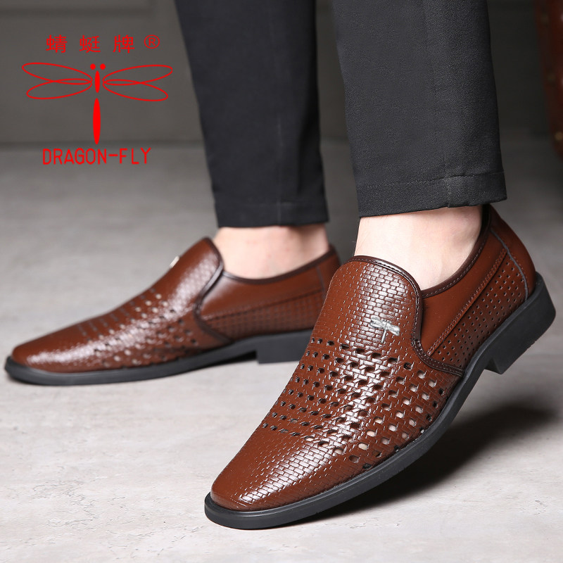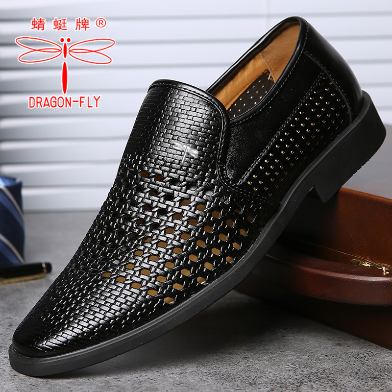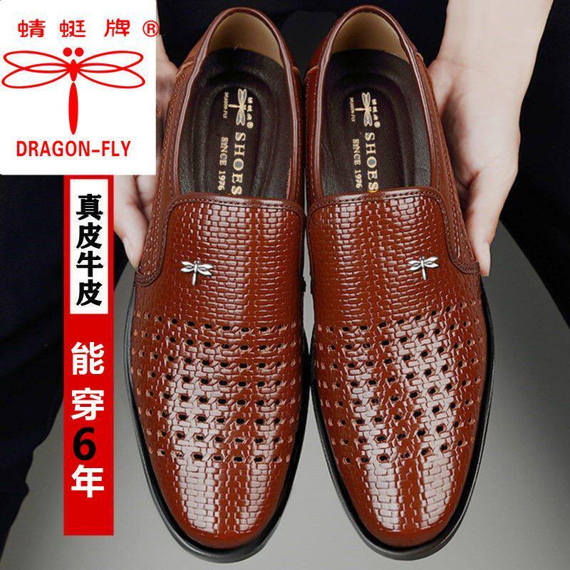 蜻蜓牌凉皮鞋男夏季镂空凉鞋男透气中老年爸爸男洞洞男士皮鞋编织