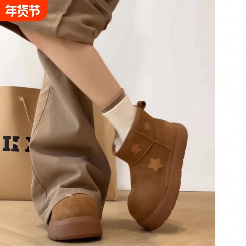 miu家厚底雪地靴女冬季真皮短靴羊毛侧拉链增高厚底加绒毛毛棉鞋
