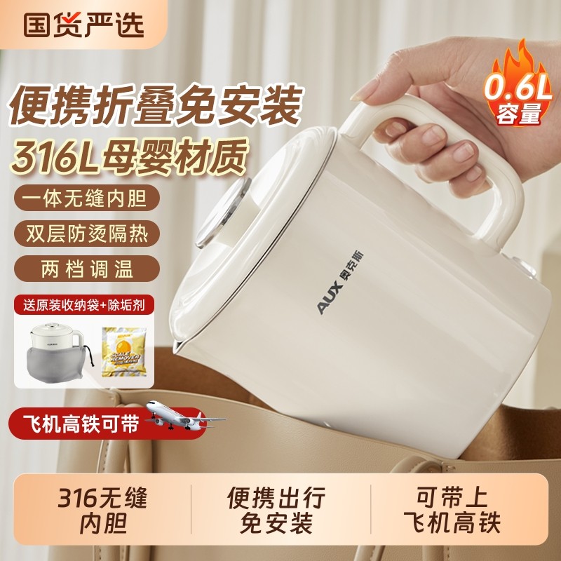 奥克斯便携烧水壶折叠旅行住酒店恒温宿舍不锈钢电热水壶小型新款