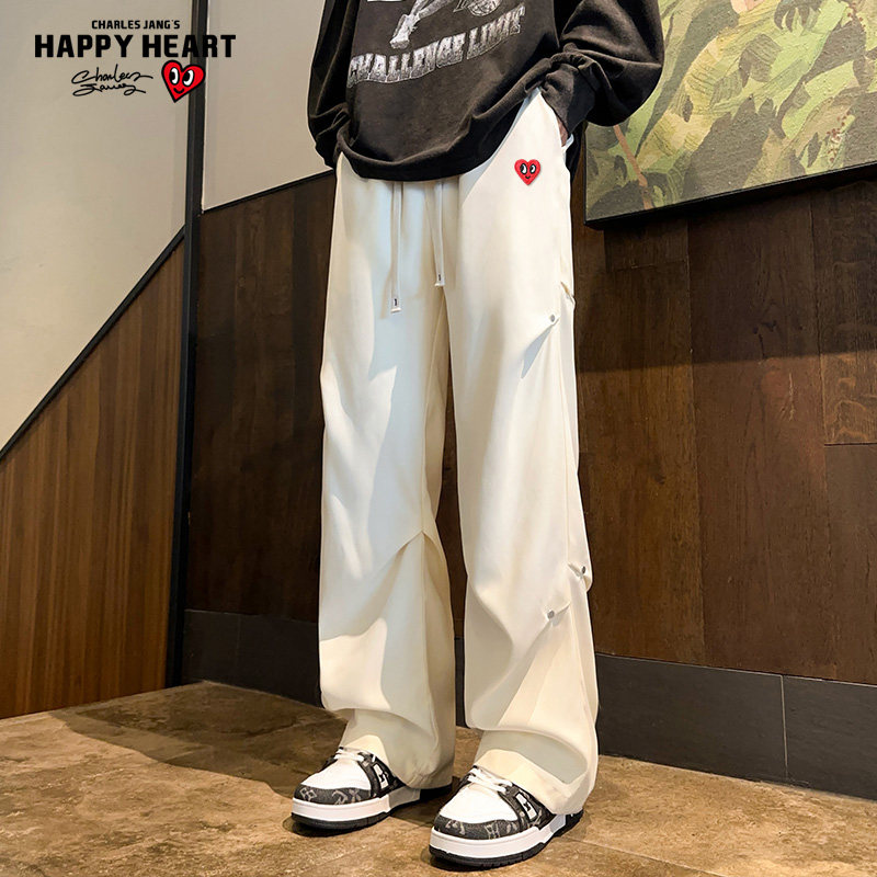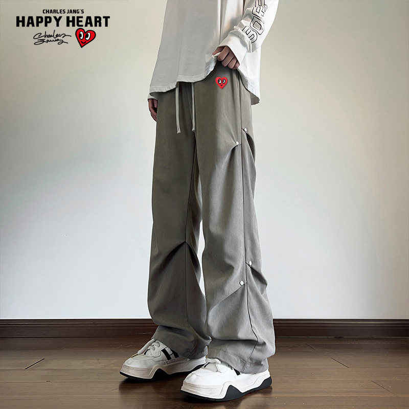 查尔斯桃心 美式宽松夏季休闲裤男纯色直筒垂感抽绳铆钉褶皱设计