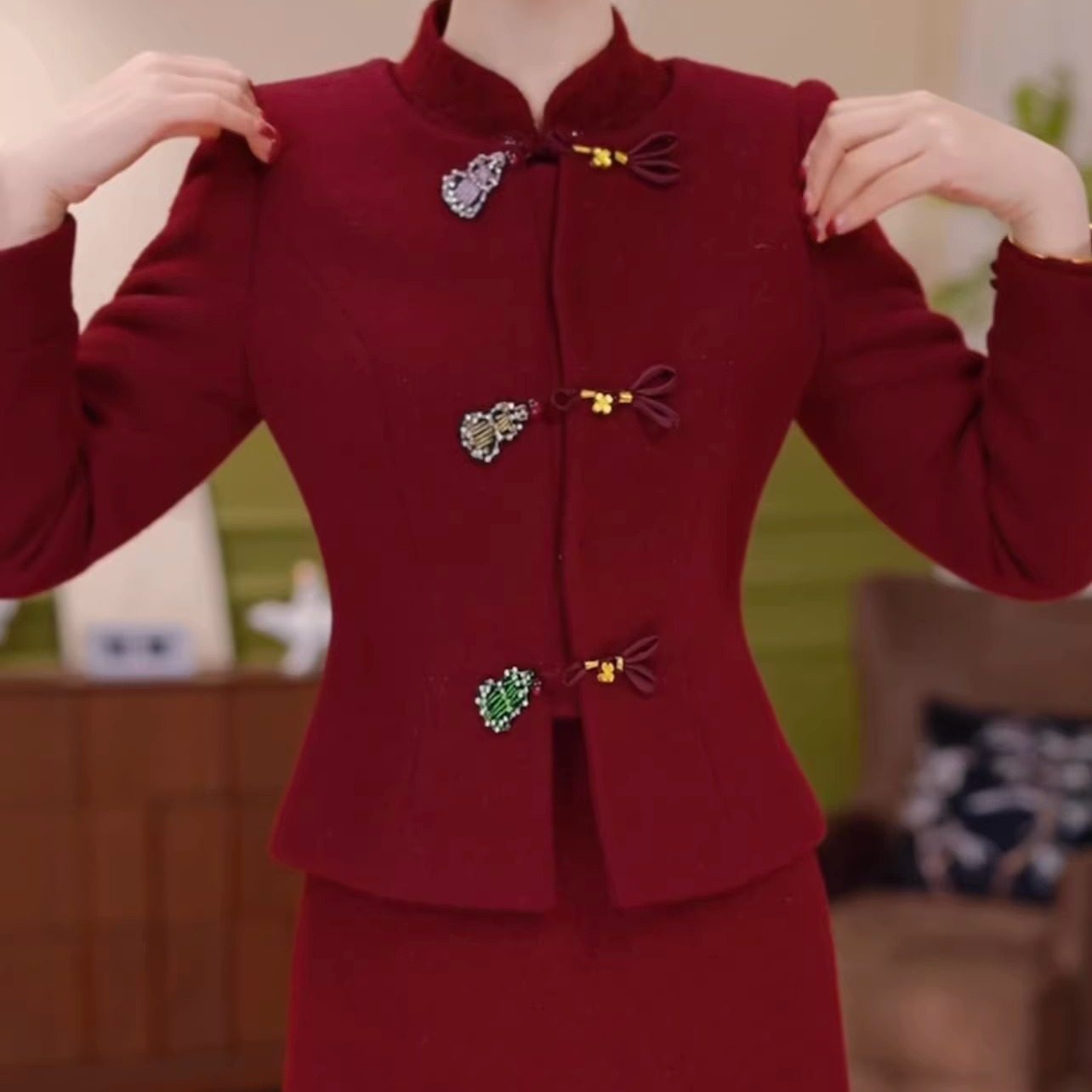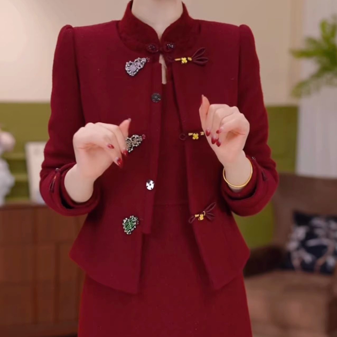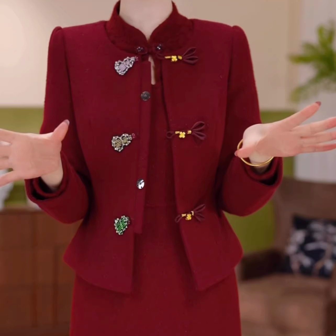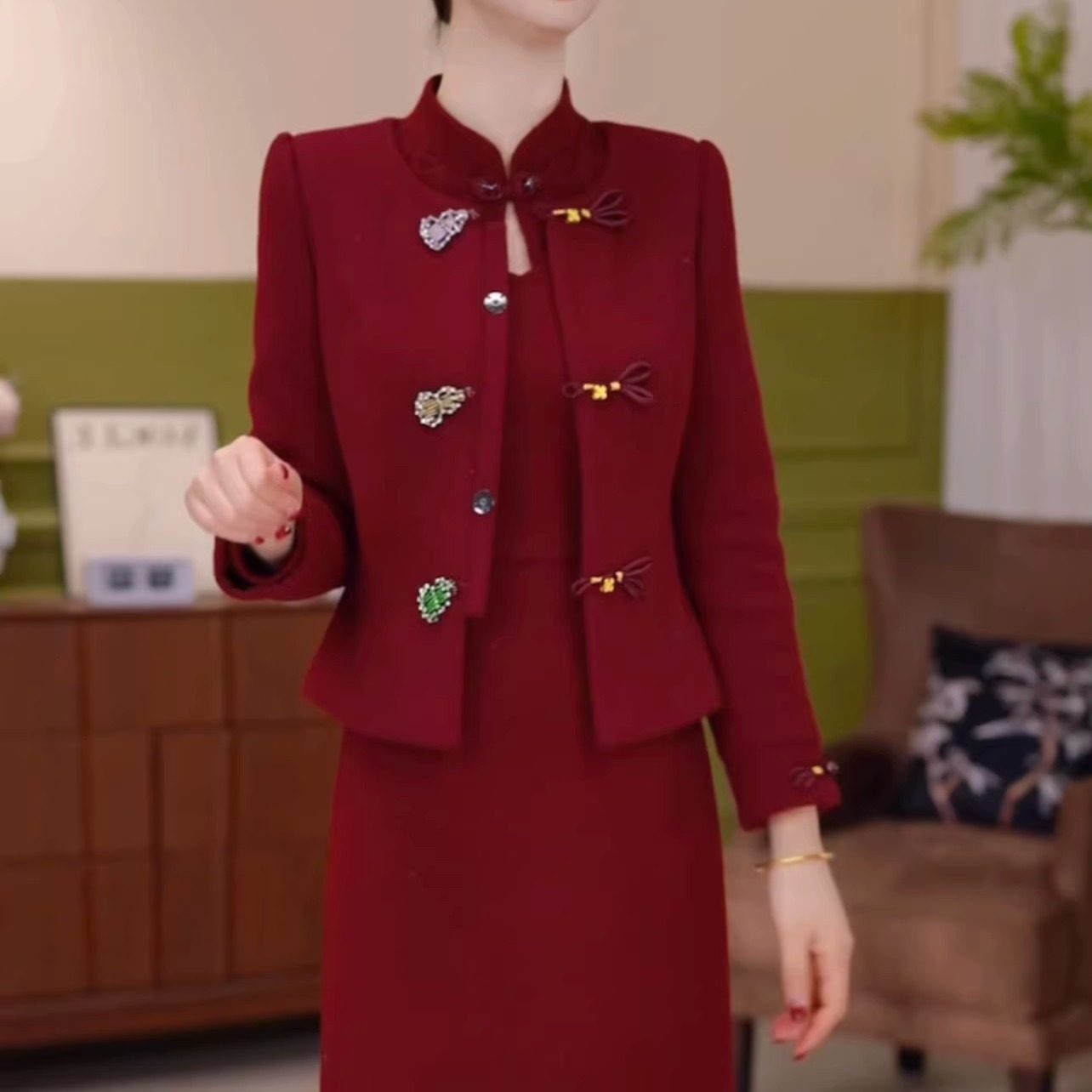 贵妃绒夹棉外套裙子两件套改良旗袍裙2026新款修身外套连衣裙套裙