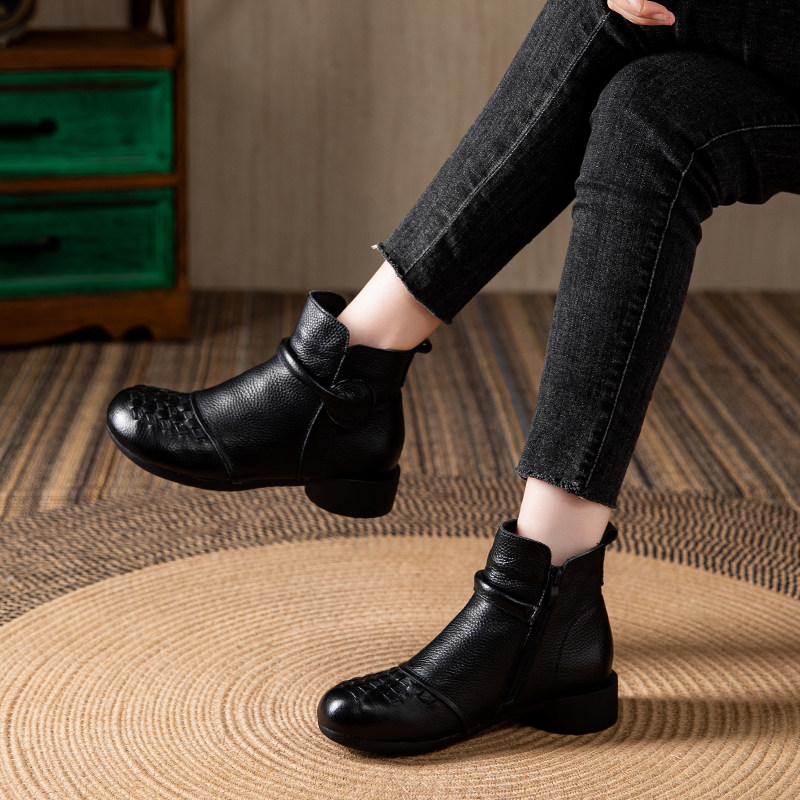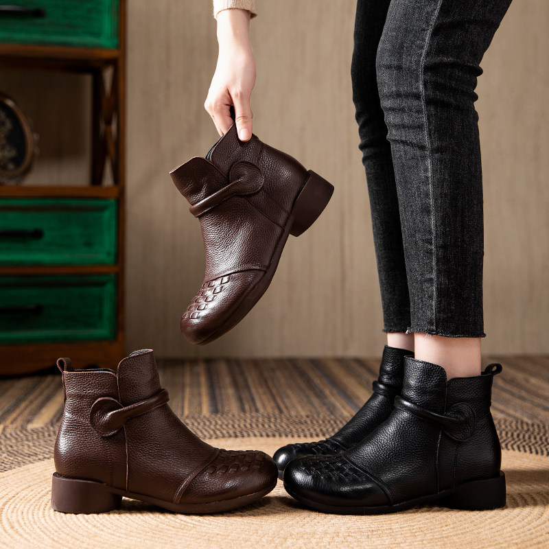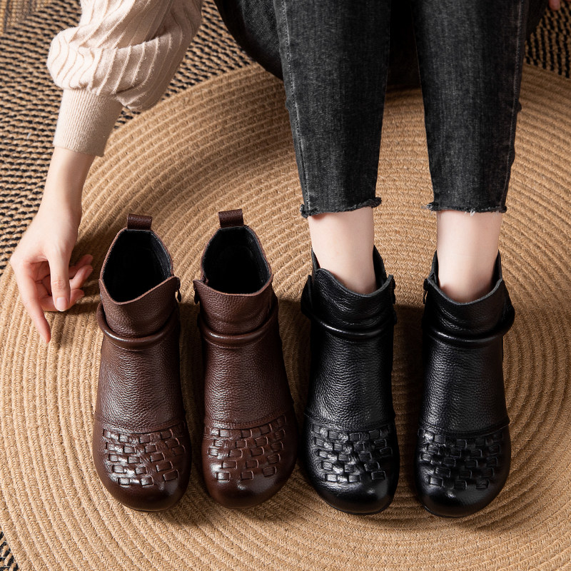 他她女孩头层牛皮秋冬2025新款复古女士短靴二棉鞋加绒真皮软防滑