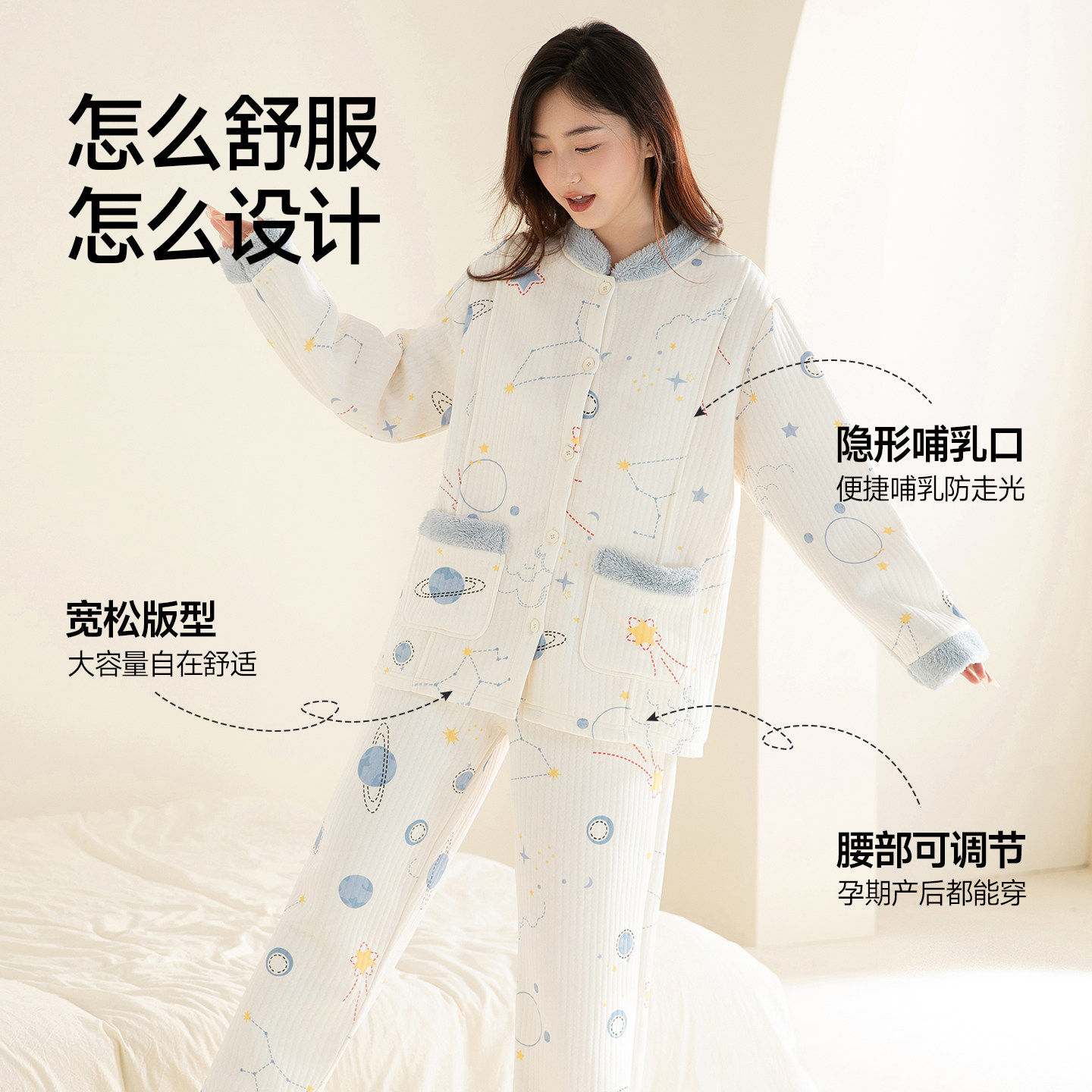 都市丽人月子服产妇哺乳衣孕妇冬季加厚睡衣三层加厚纯棉家居服秋