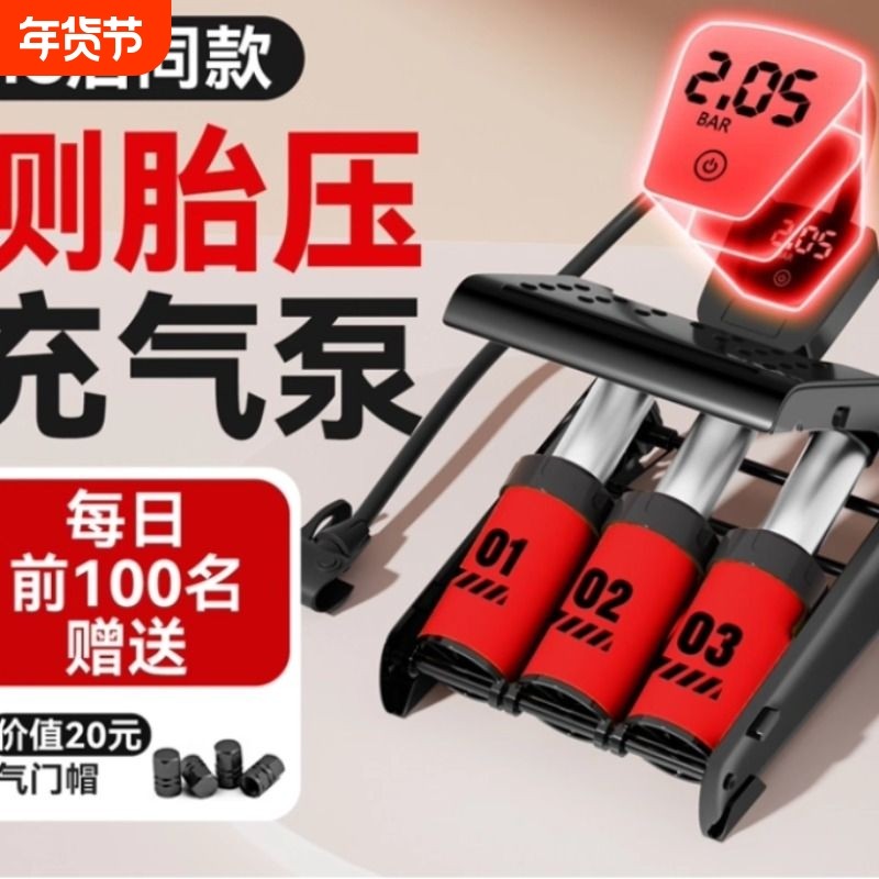 脚踏式汽车打气筒高压车载适用 加粗合金双缸耐用 三缸脚踩充气泵