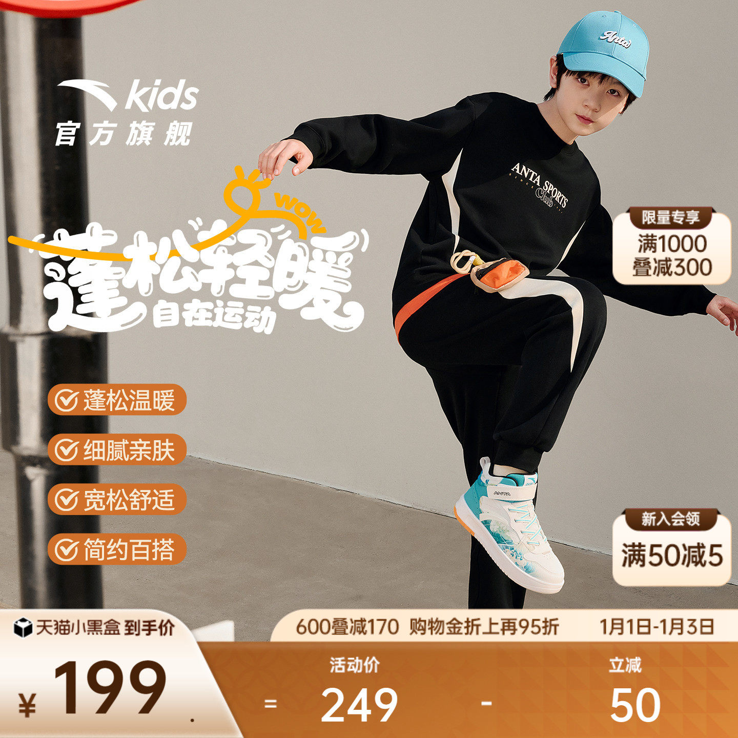 安踏儿童装男童套装加绒秋冬2025新卫衣卫裤时尚两件套保暖秋装潮