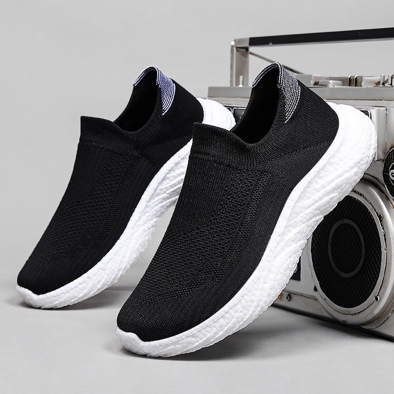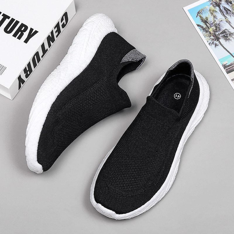 热风新男鞋夏季透气一脚蹬黑色网鞋飞织网面运动跑步鞋休闲软底老