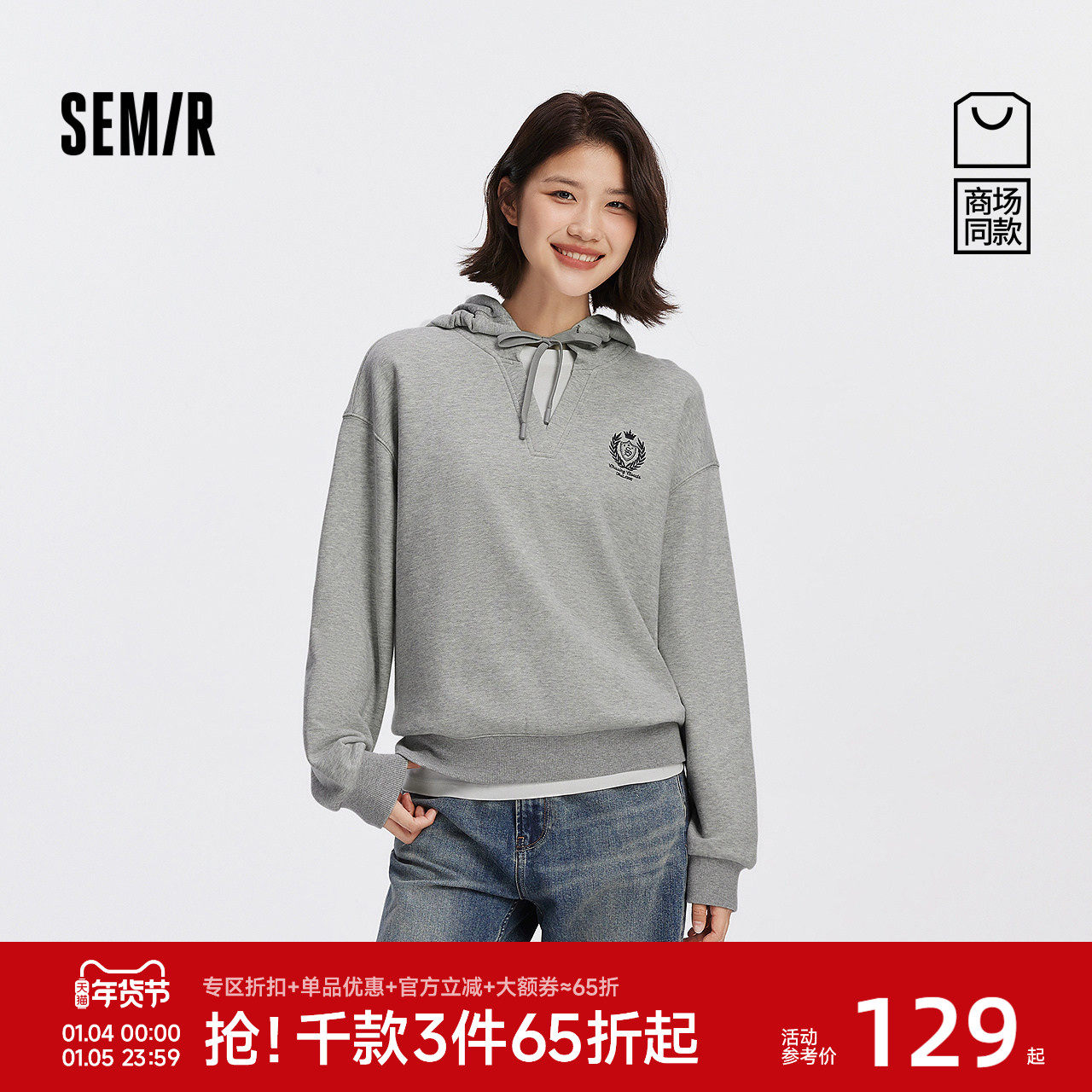 [商场同款]森马卫衣女连帽oversize慵懒2025秋新款刺绣假两件上衣