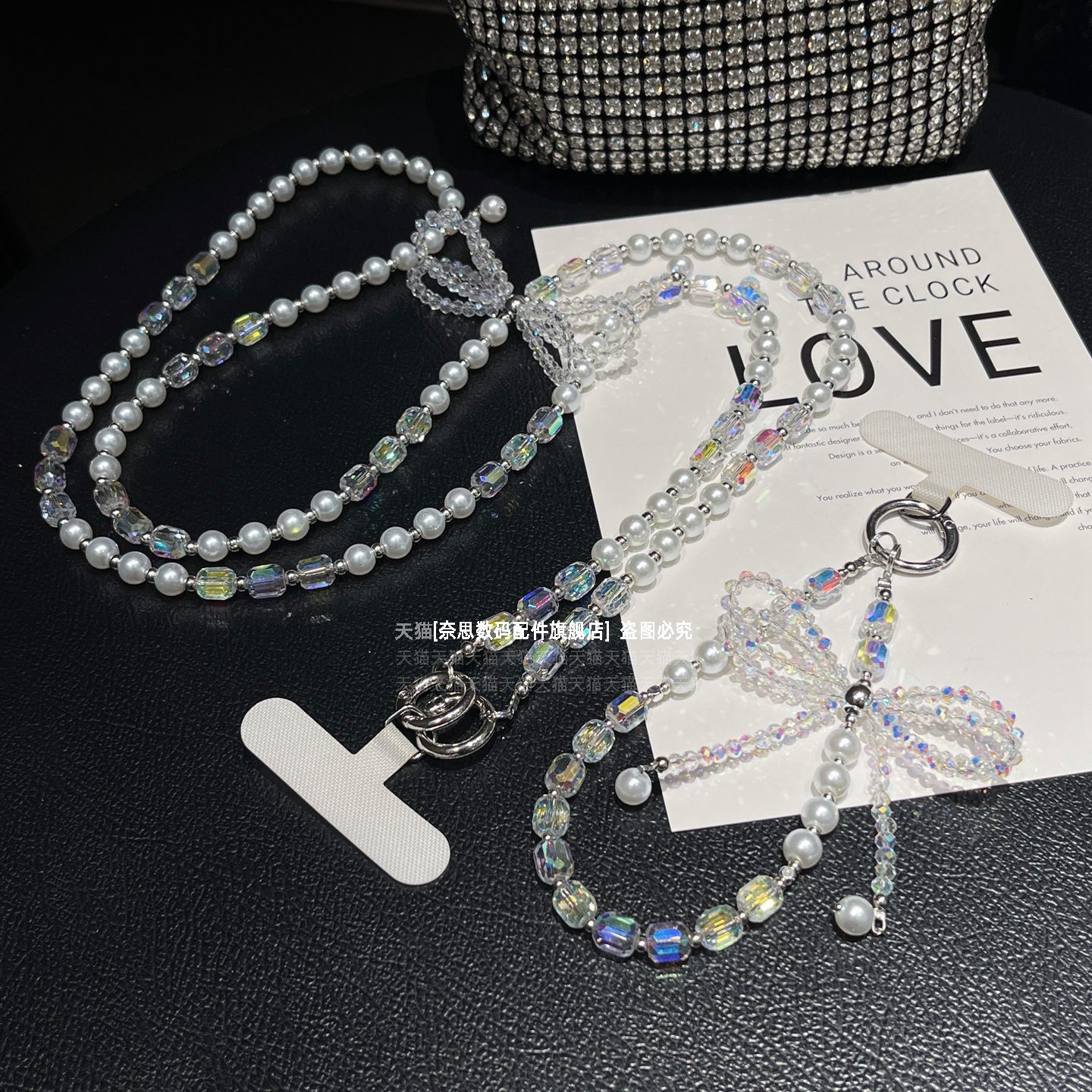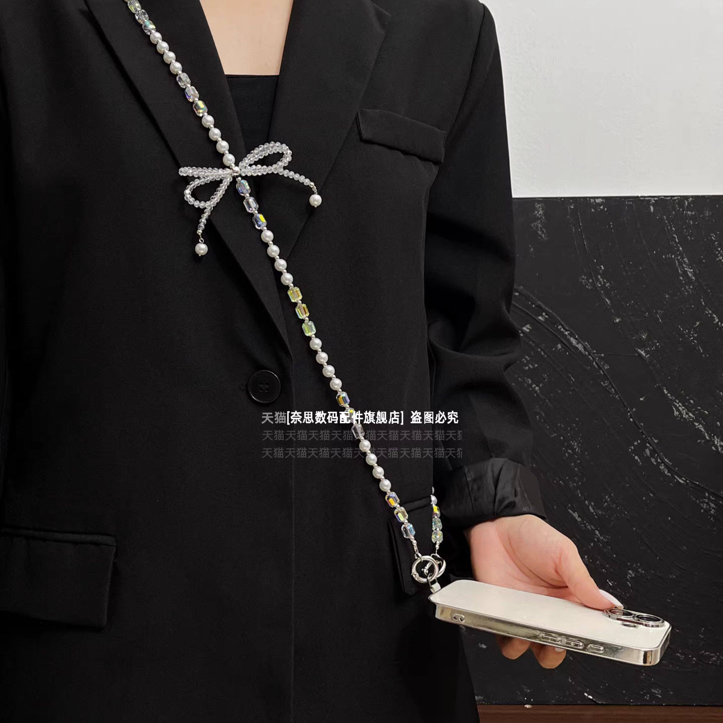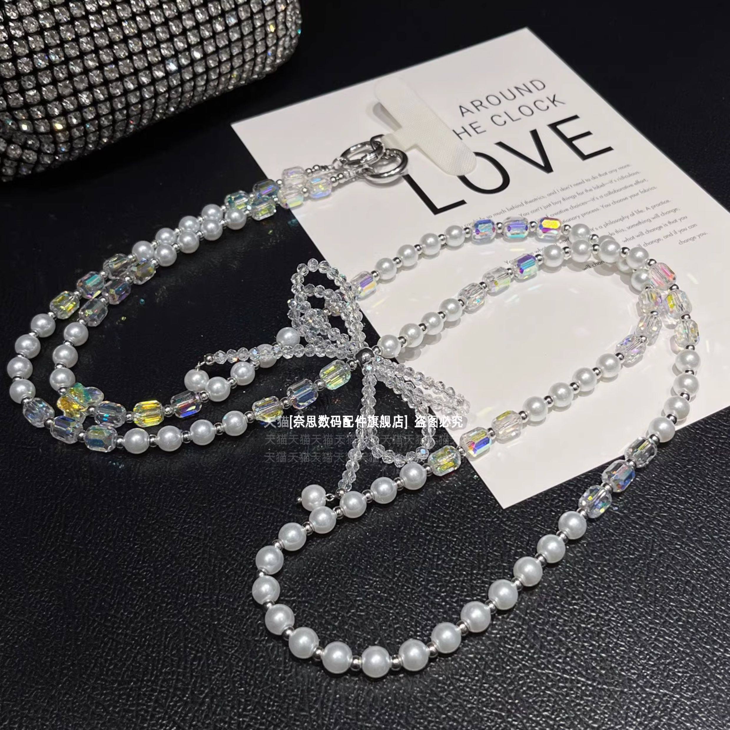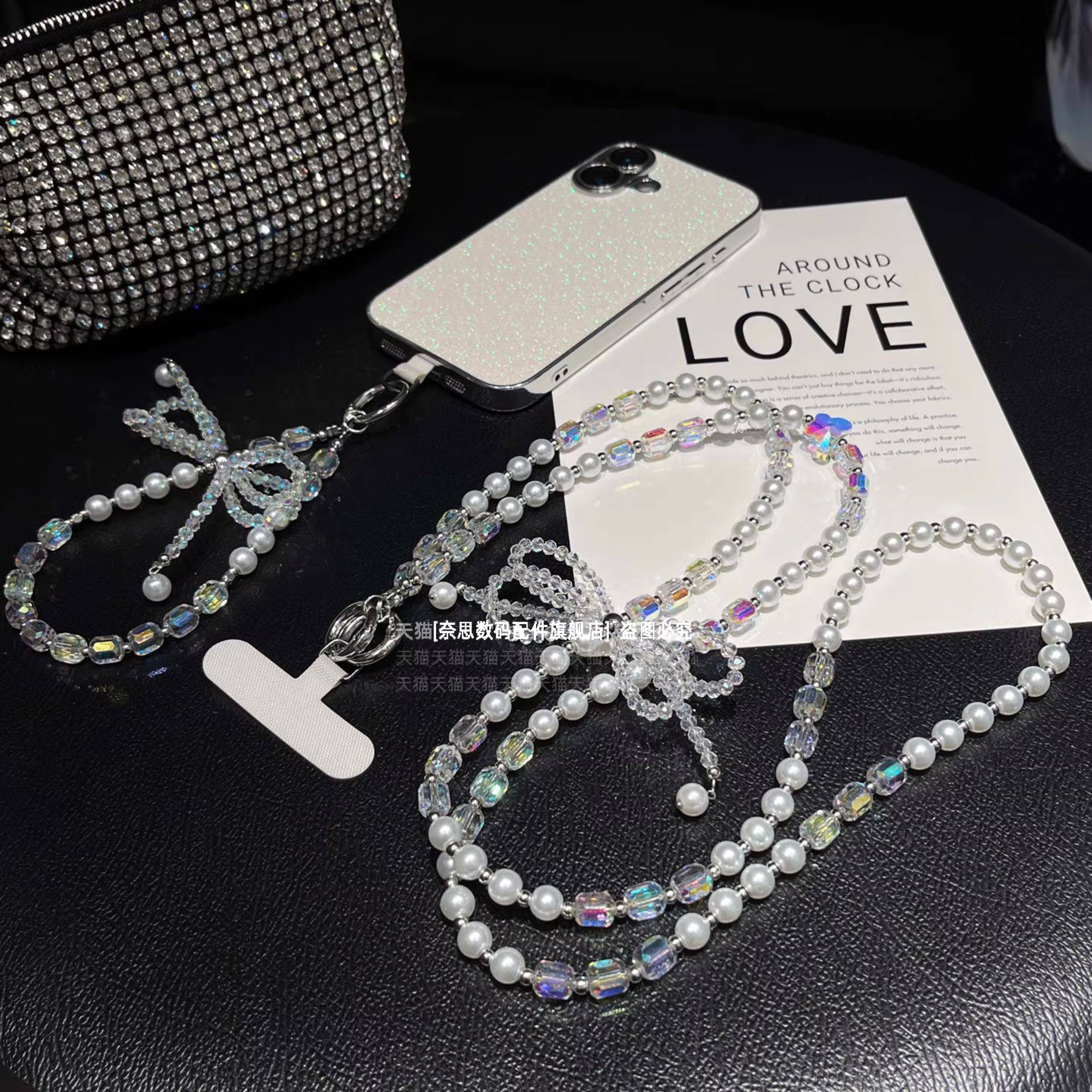 超闪水晶珍珠手机链轻奢精致手腕挂链手工串珠蝴蝶结背带链条斜挎可背包包挂饰垫片高级感手提手链防丢防摔壳