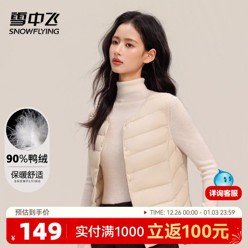 雪中飞25秋新款女士短款V领轻薄羽绒马甲背心纯色简约分格百搭W
