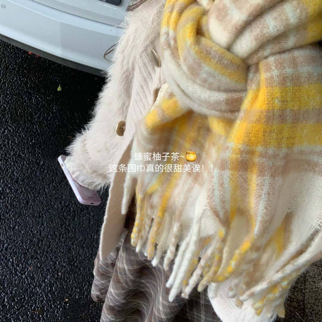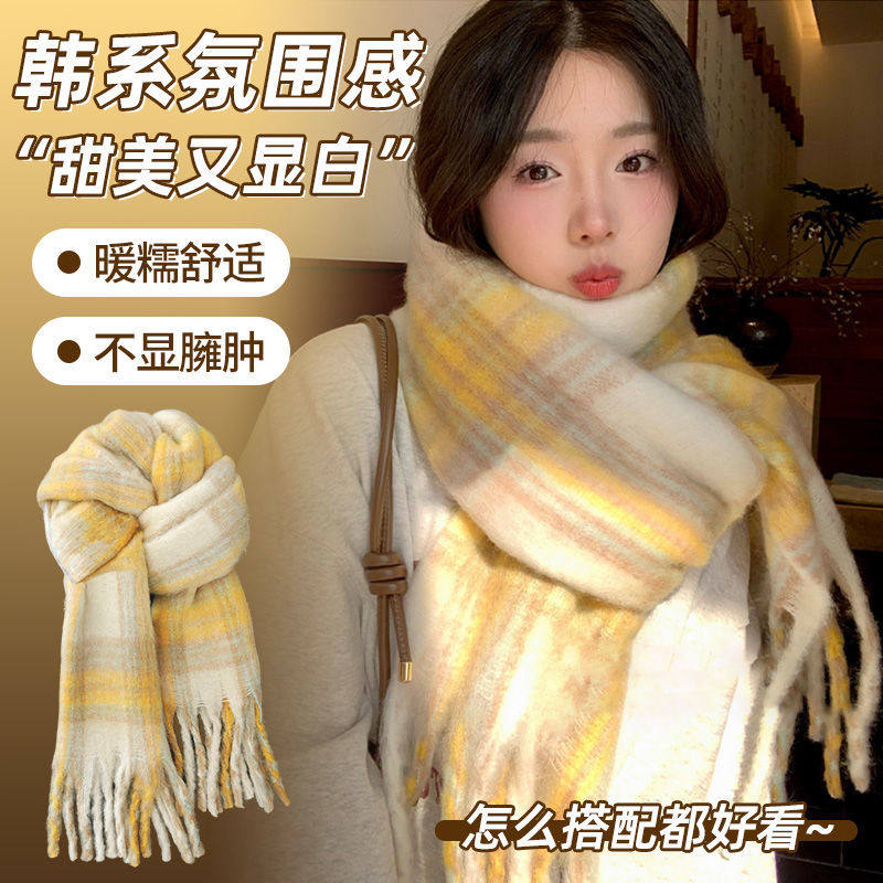 韩系高级感围巾女冬季2025新款百搭显白奶黄格子披肩加厚保暖围脖