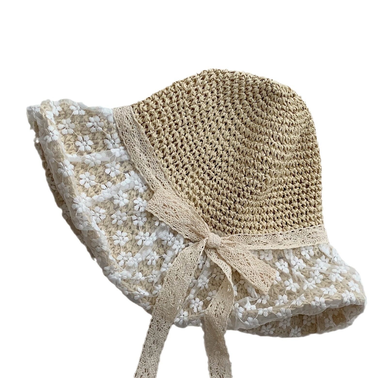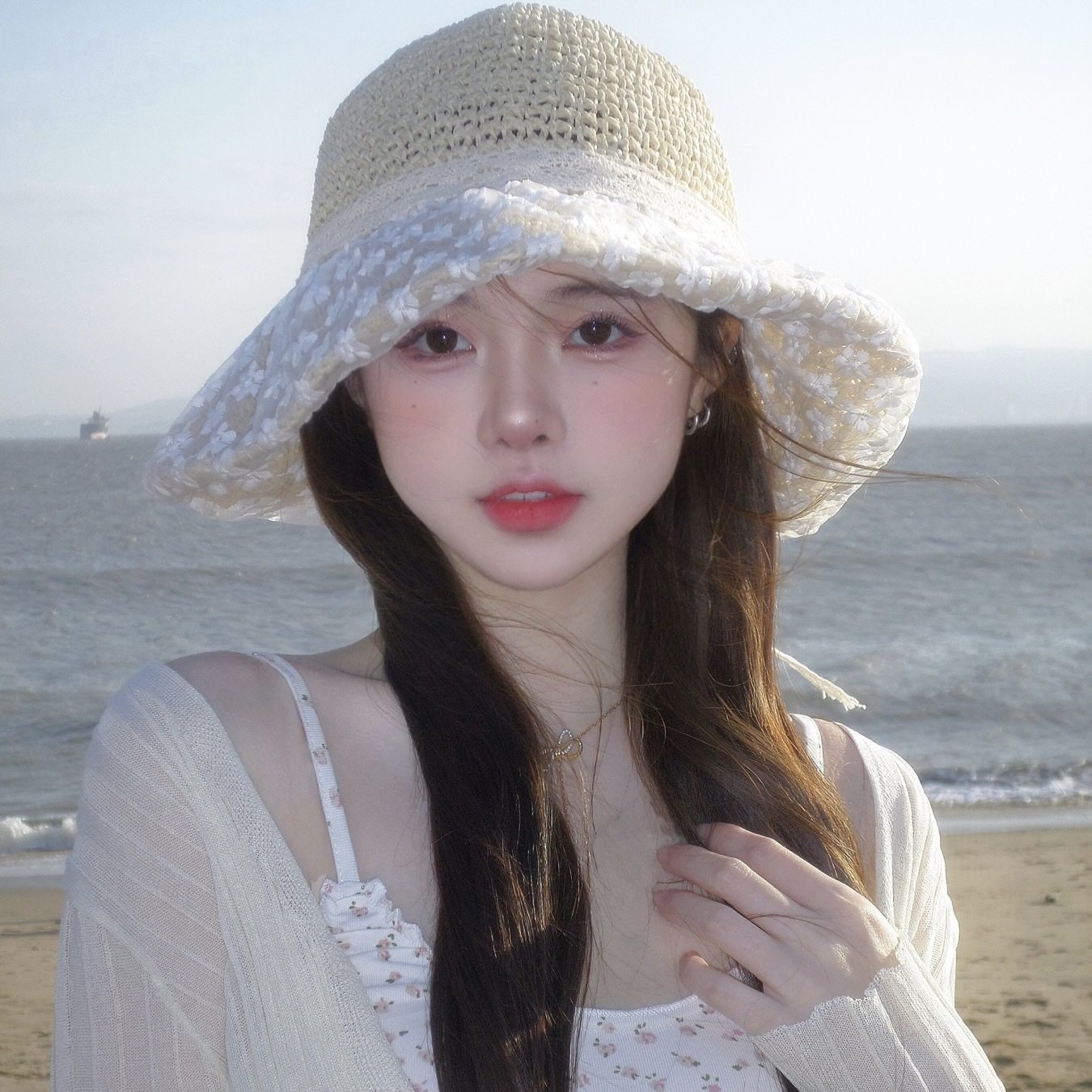日系花朵蕾丝草编帽子女夏季出游海边度假赫本风遮阳帽大帽檐圆顶