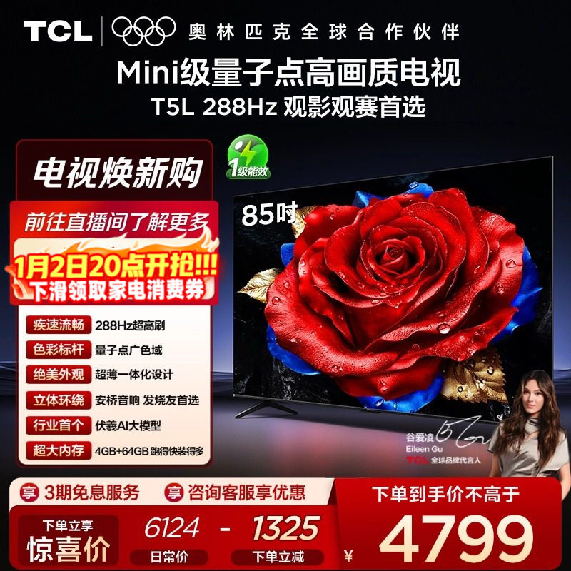 TCL电视 85T5L 85英寸288Hz高刷QLED量子点灵控系统超薄网络电视