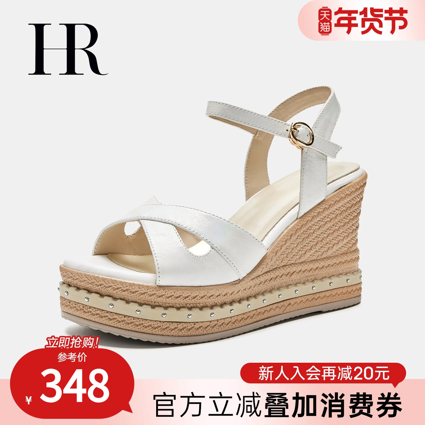 HR赫莲娜女鞋子2025夏季新款坡跟真皮凉鞋厚底防水台百搭一字扣带