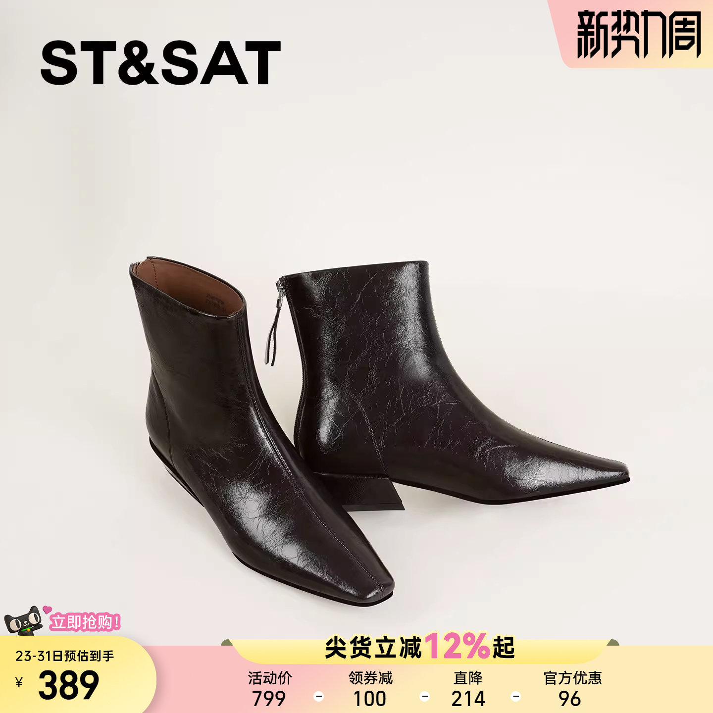 星期六法式短靴女2025秋冬气质方头粗跟高级感裸靴真皮英伦风皮靴
