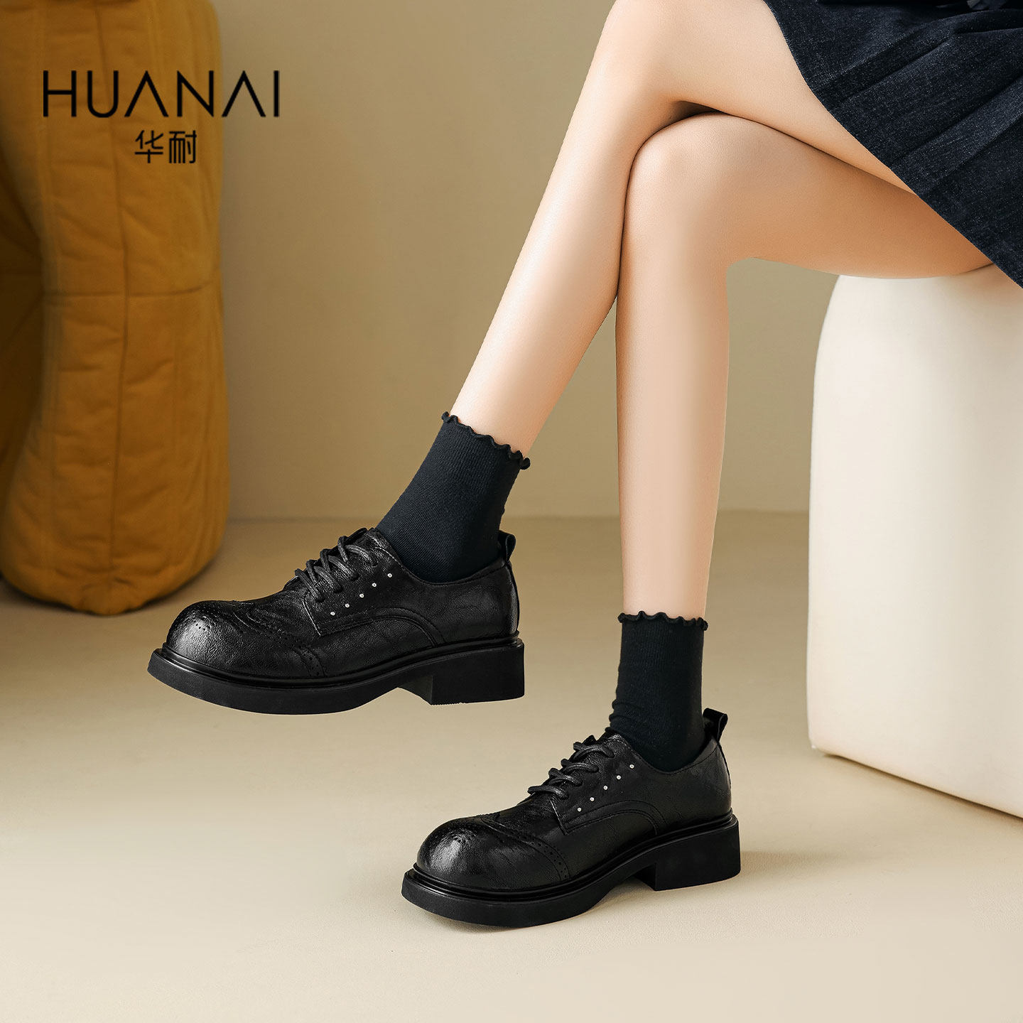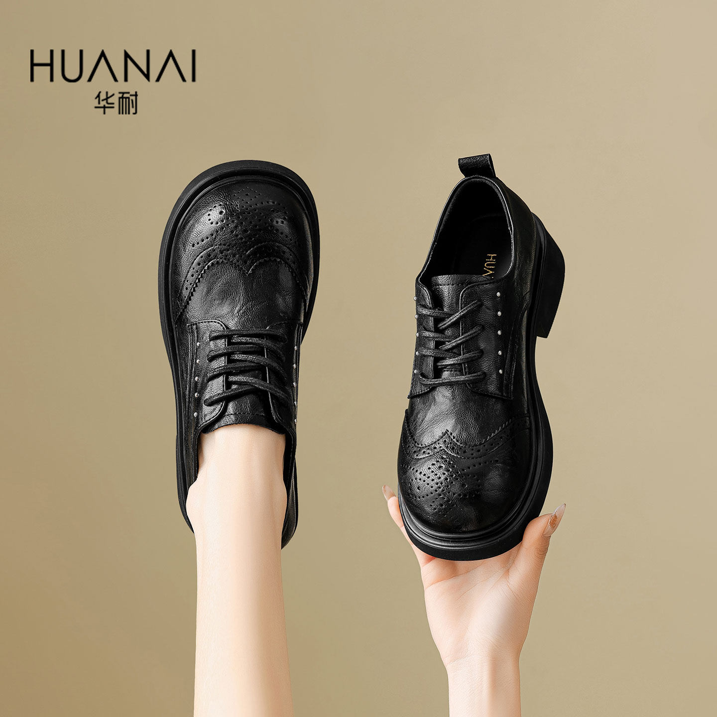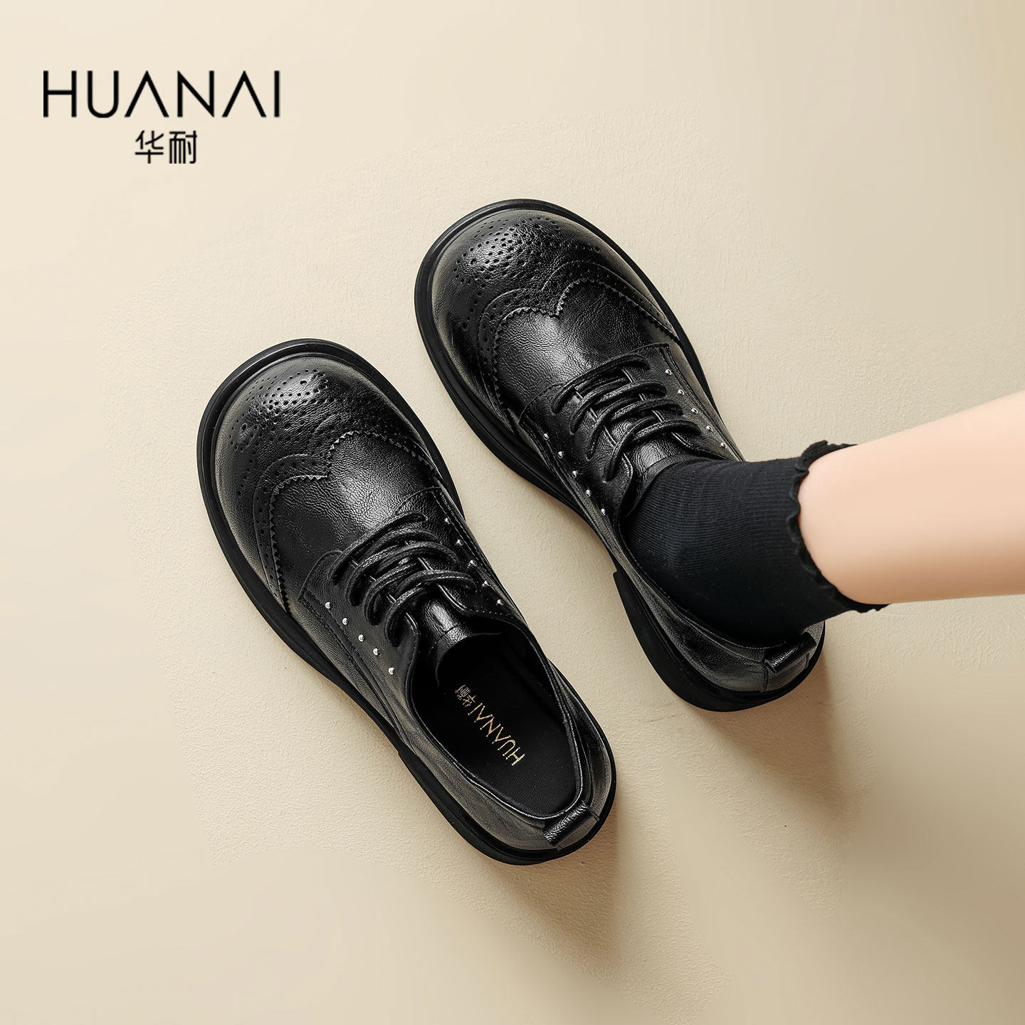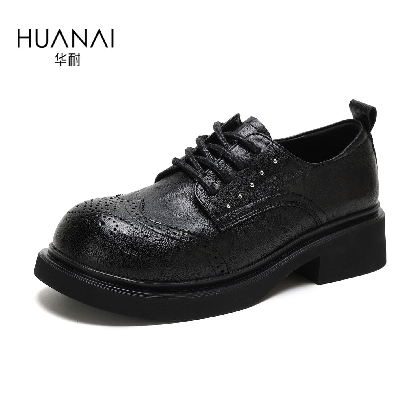 华耐黑色小皮鞋女2026春季新款厚底乐福鞋系带粗跟布洛克单鞋女鞋