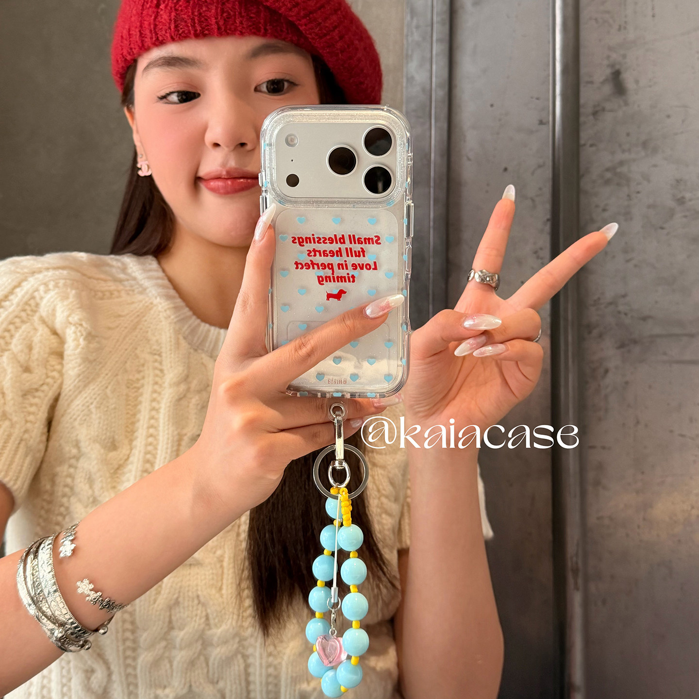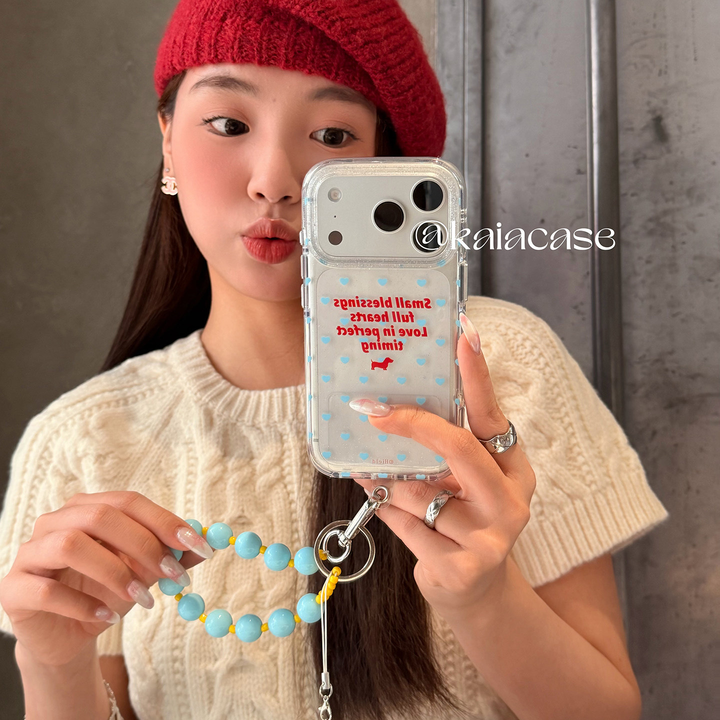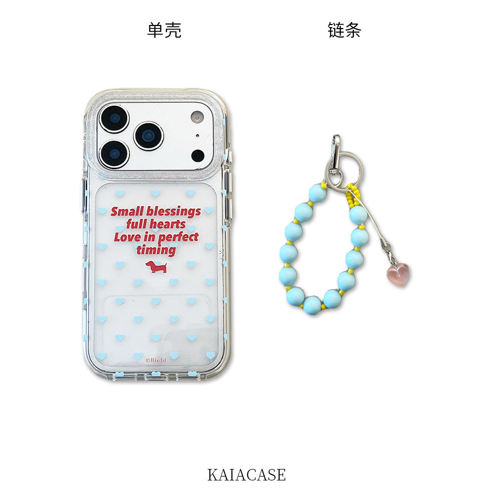 kaia日韩ins简约蓝爱心英文适用苹果17promax手机壳iphone16pro新款15女14pro带链条15pro透明全包防摔手机套