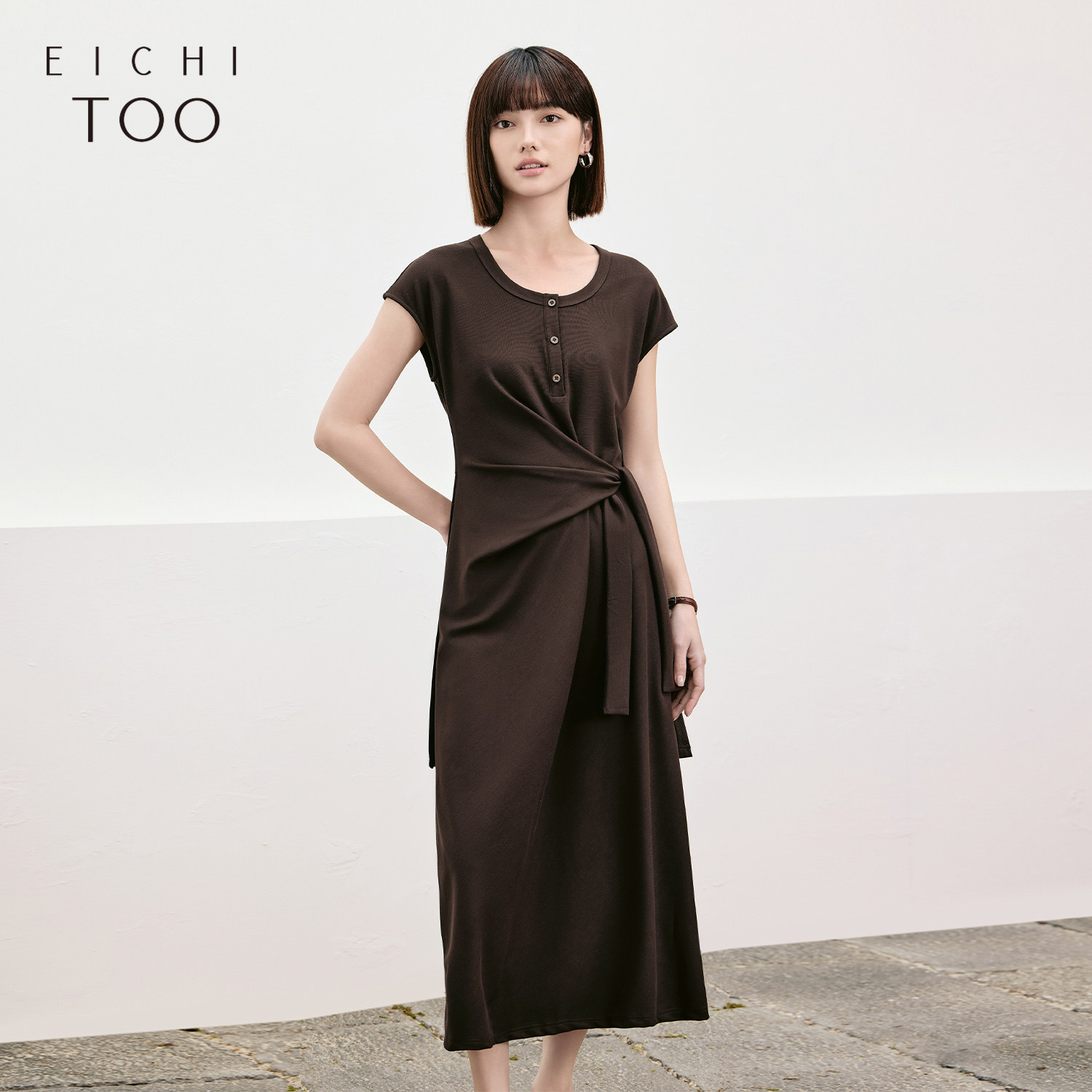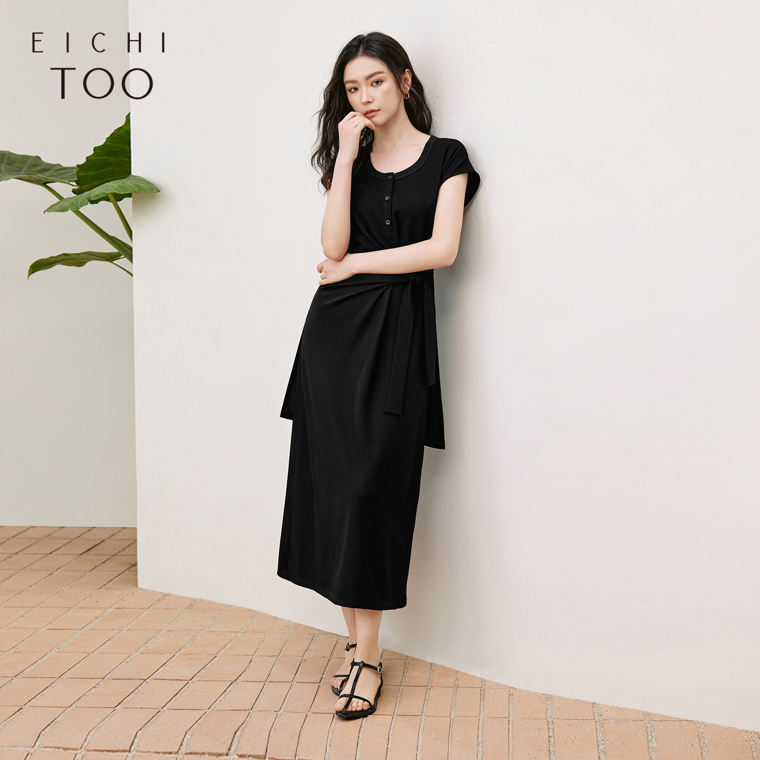 【热销补货】欧时力 褶皱短袖连衣裙女2026春新款收腰显瘦小黑裙