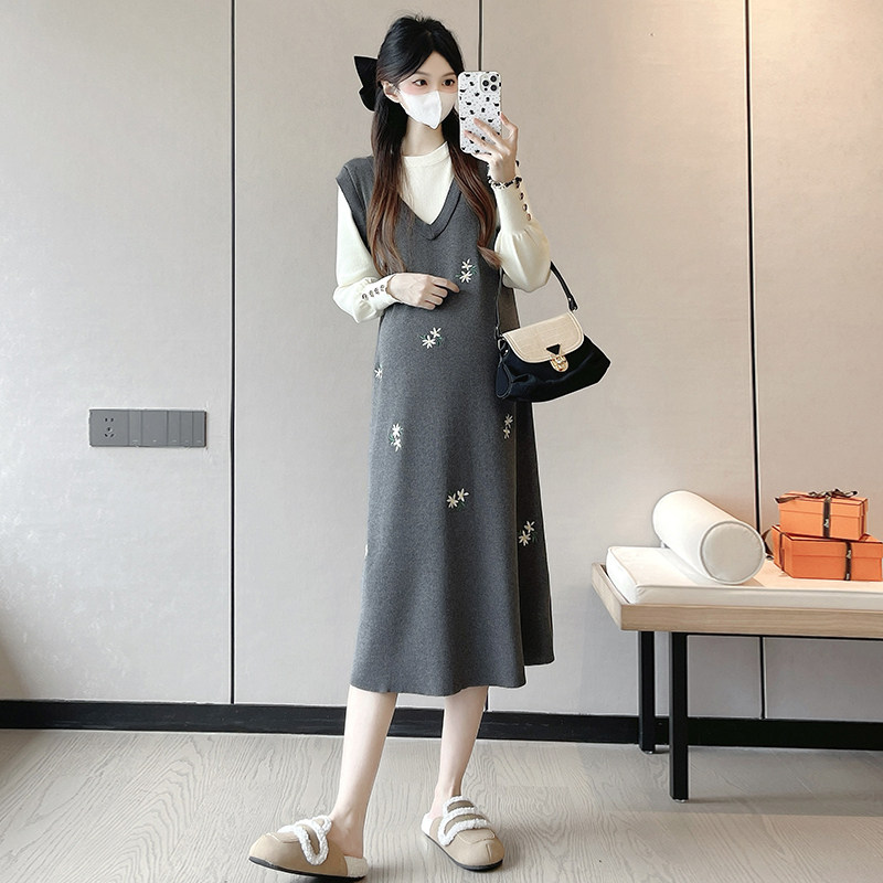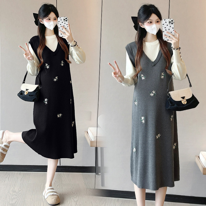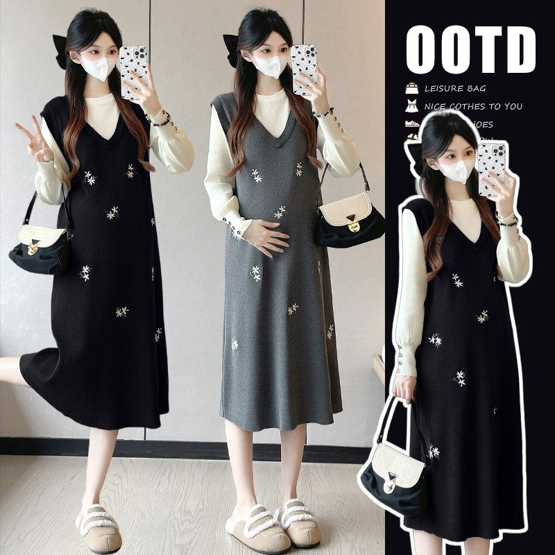 婧麒孕妇装高级孕妇连衣裙洋气冬装孕期漂亮新年穿搭刺绣孕妇裙子