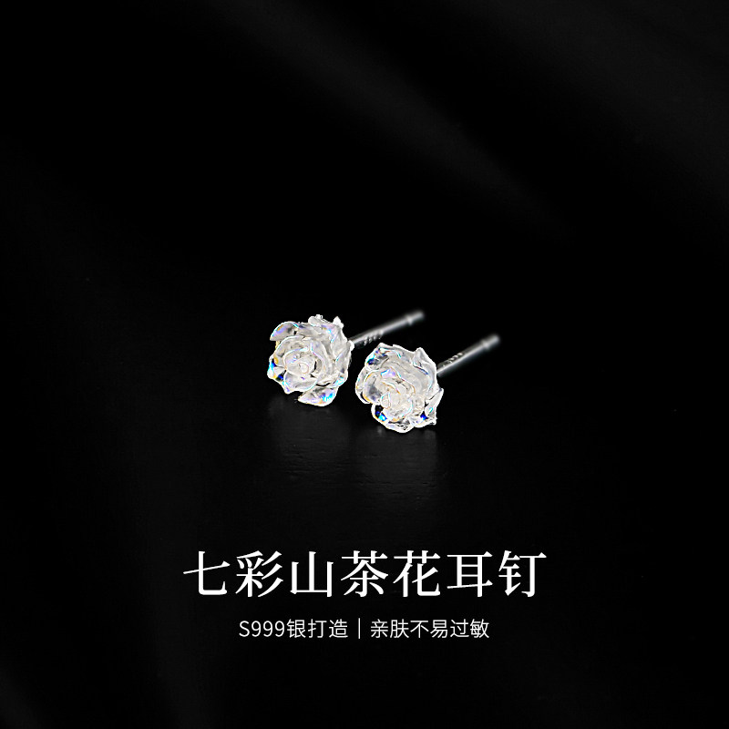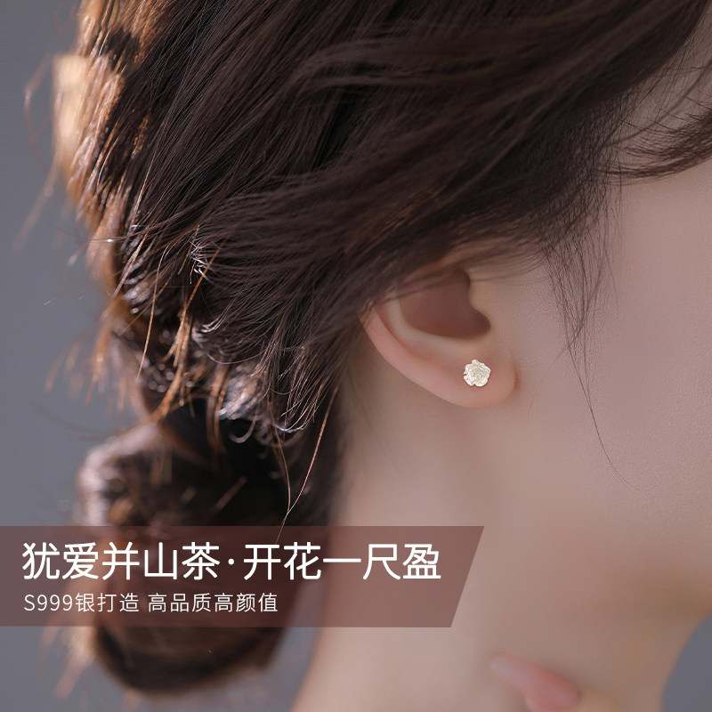 S999纯银山茶花耳钉女2025新款爆款养耳洞耳环高级感精致耳饰独特