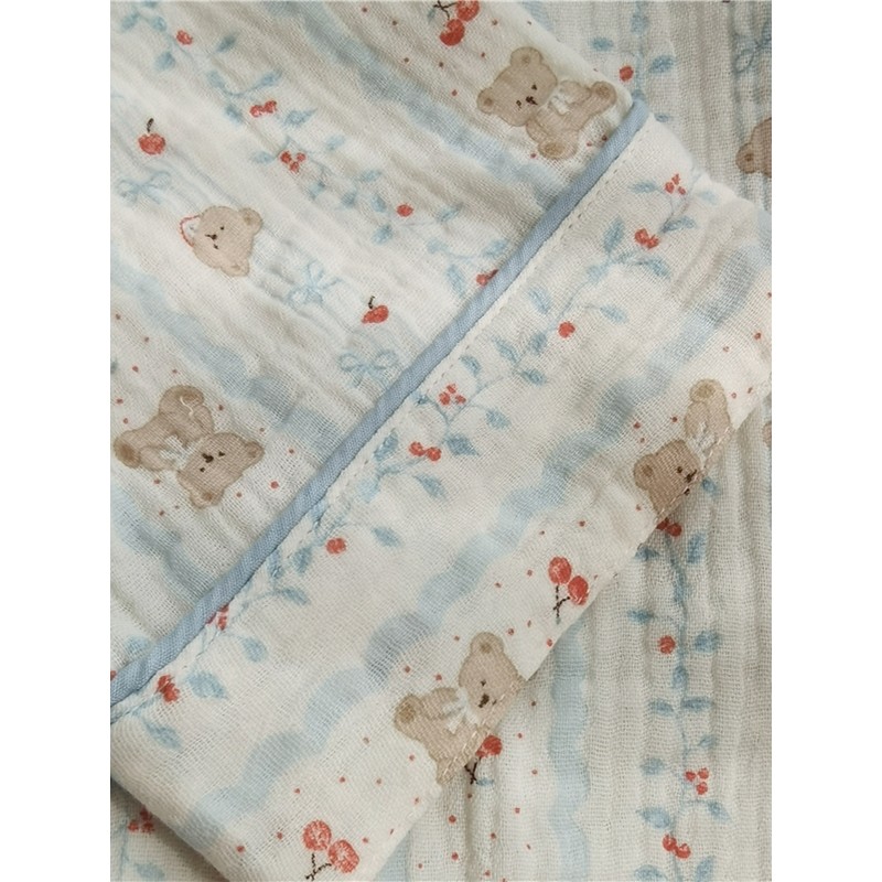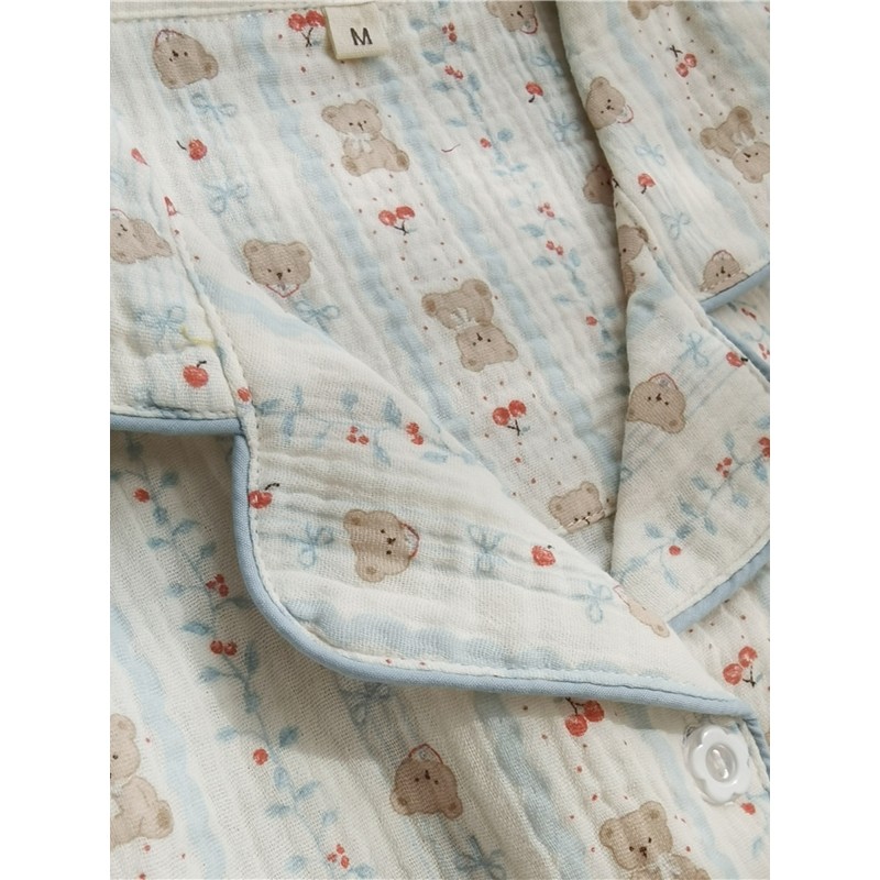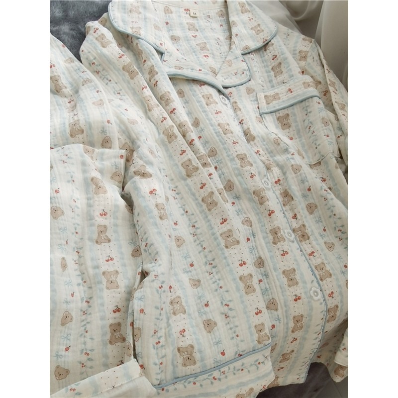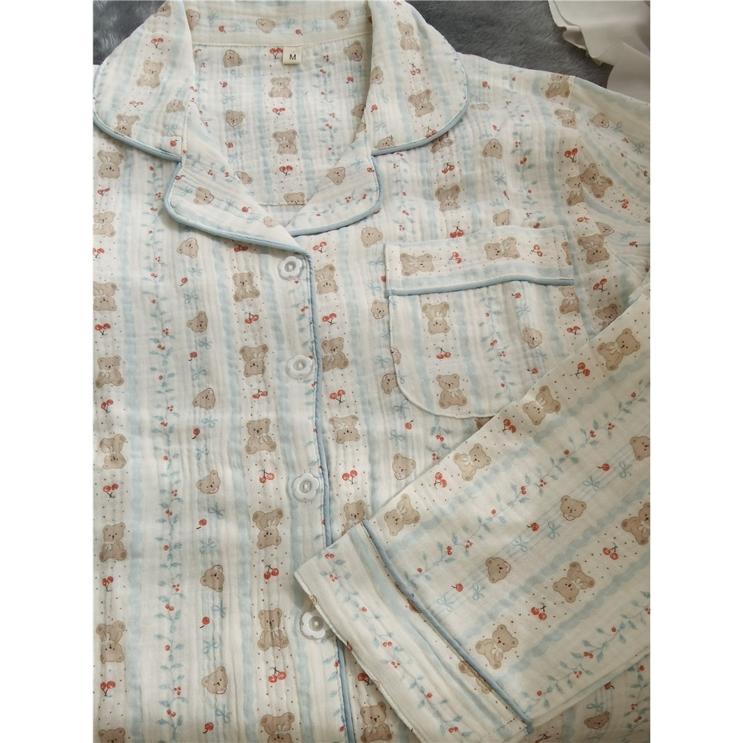 红豆纯棉双层纱布睡衣家居服长袖长裤治愈系小熊蓝色清新女生春夏