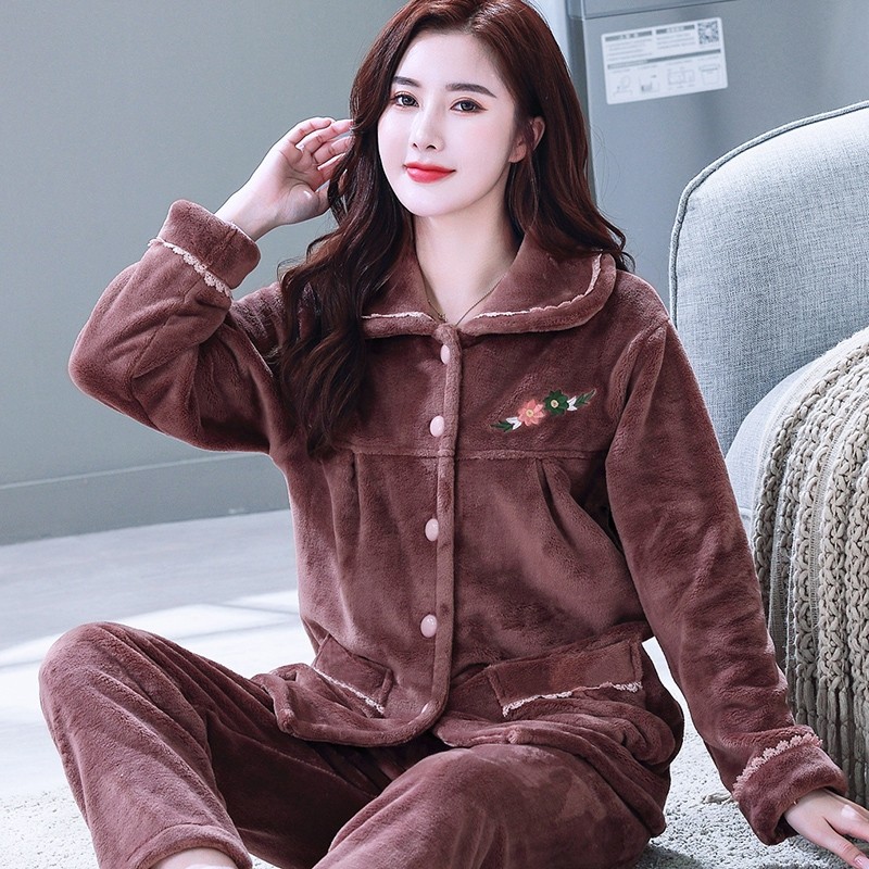 红豆法兰绒秋冬加厚保暖中老年女士睡衣套装大码简约甜美珊瑚绒家