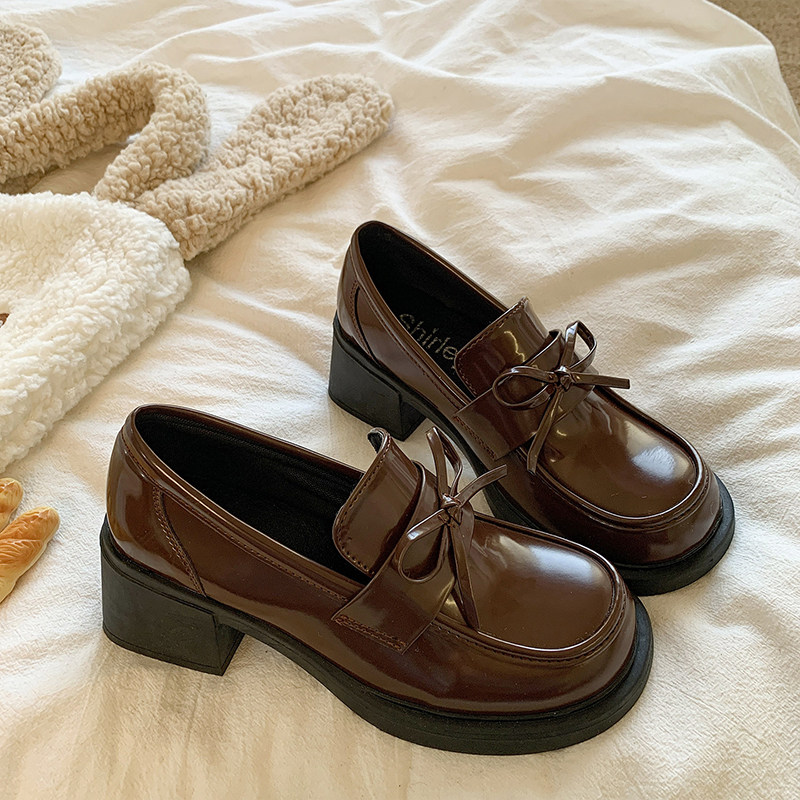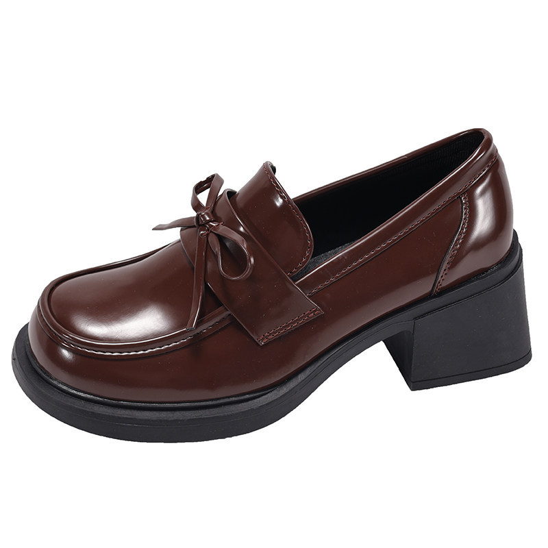 羊皮~棕色山茶花乐福鞋女2025新款通勤粗跟单鞋百搭英伦风小皮鞋