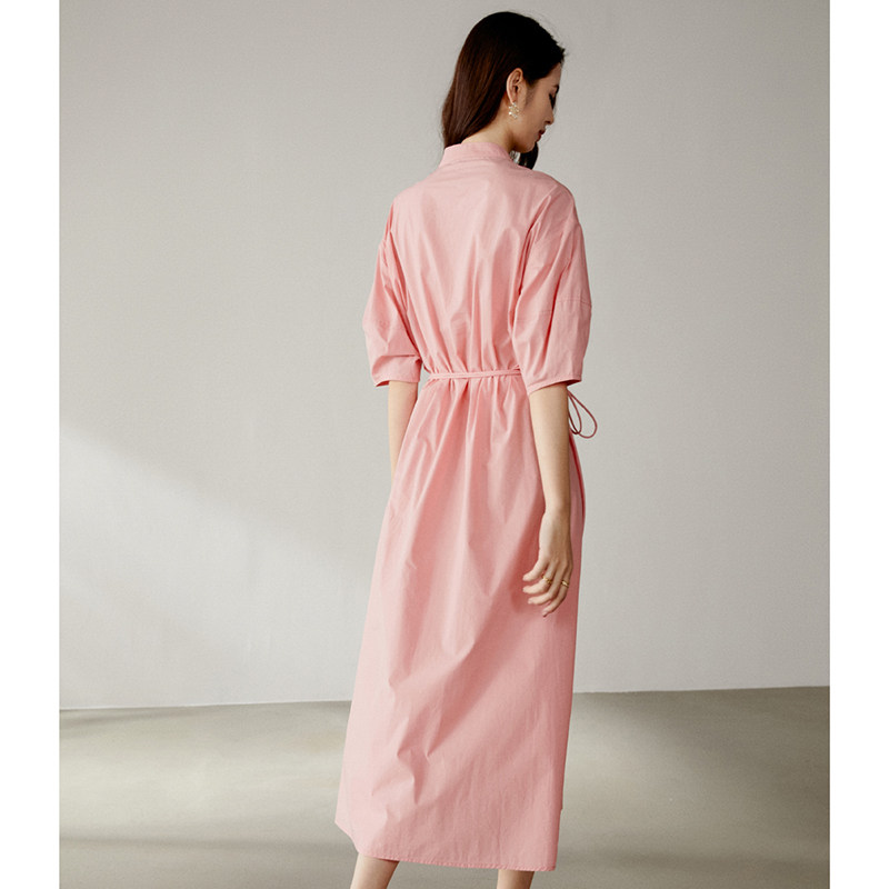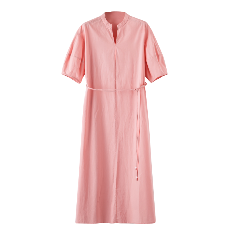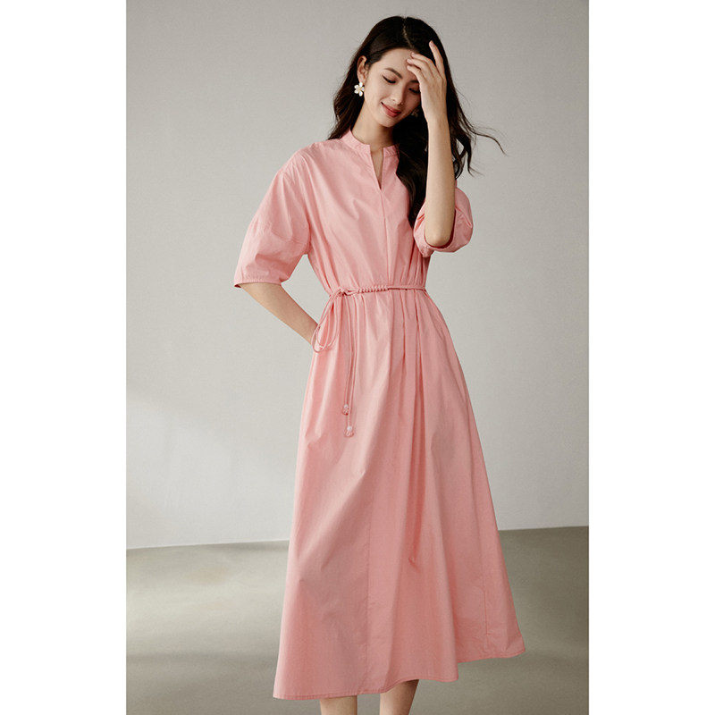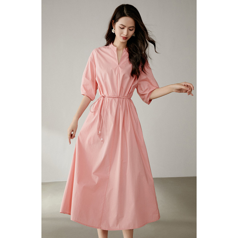 晚白2026年春新款V型立领全棉裙子系带收腰宽松遮肉大码连衣裙