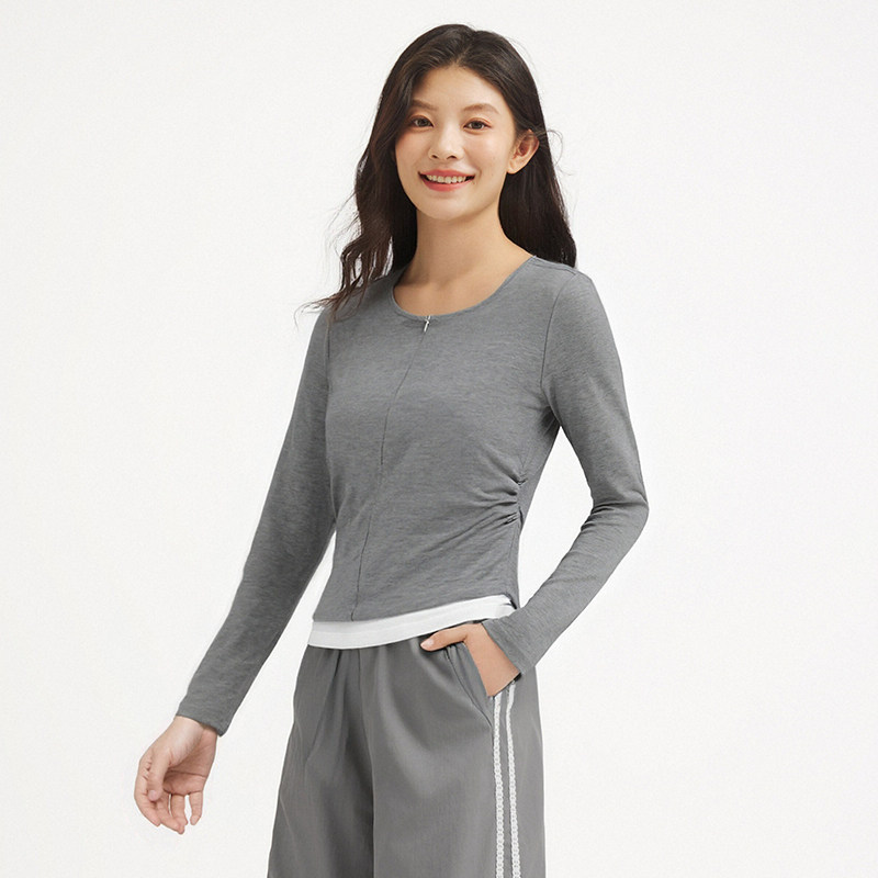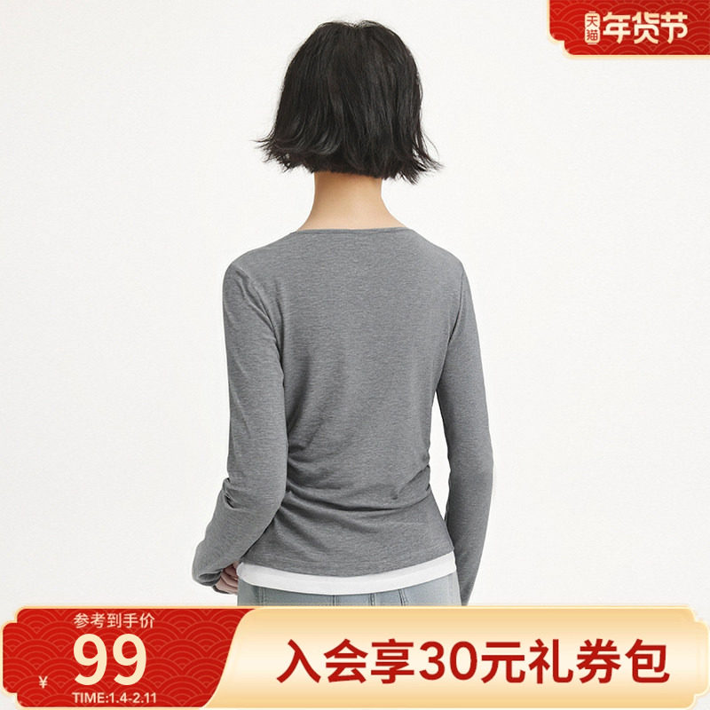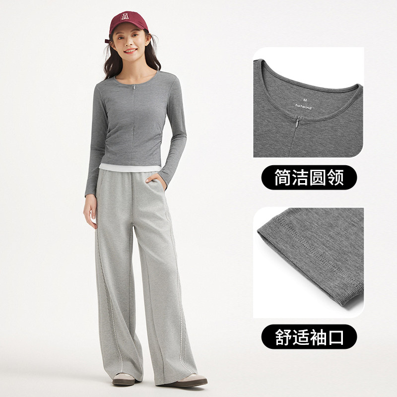热风2026年春季新款女士半开拉链假两件长袖T恤修身显瘦亲肤舒适