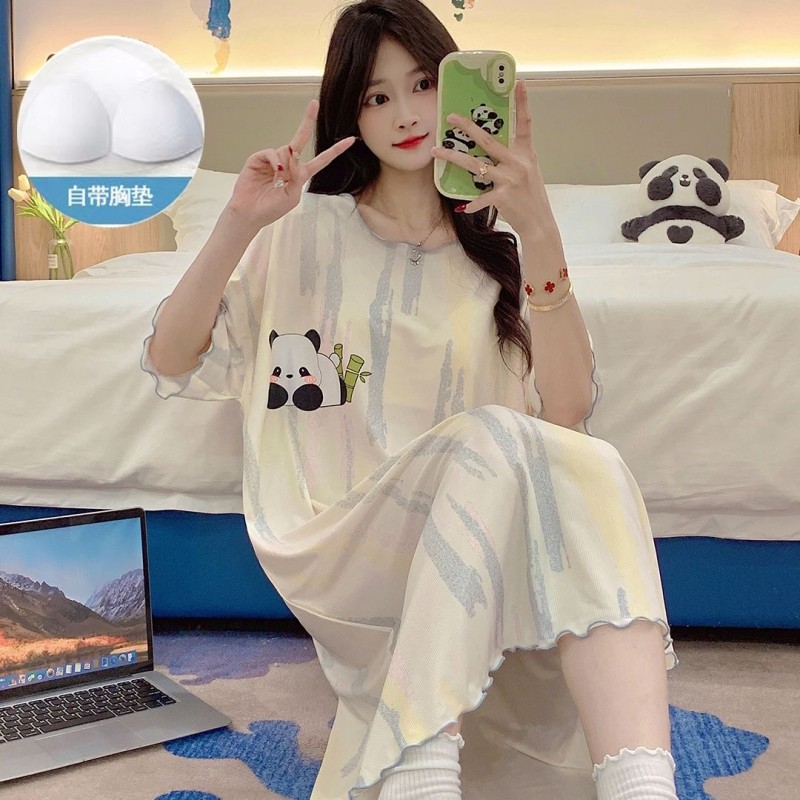 睡裙女冰丝绸夏季短袖带胸垫睡衣女士2024新款宽松薄款孕妇家居服