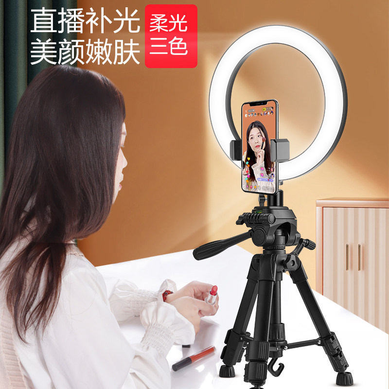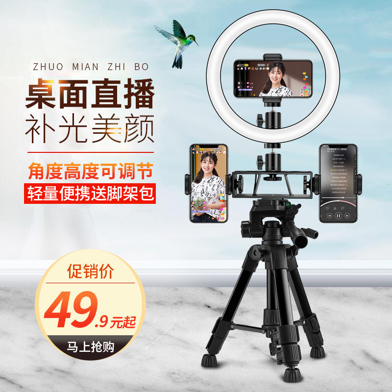迷你便携小巧桌面手机支架三脚架多功能主播专用直播设备带补光灯美颜自拍摄影三角架落地架摄像拍照录视频