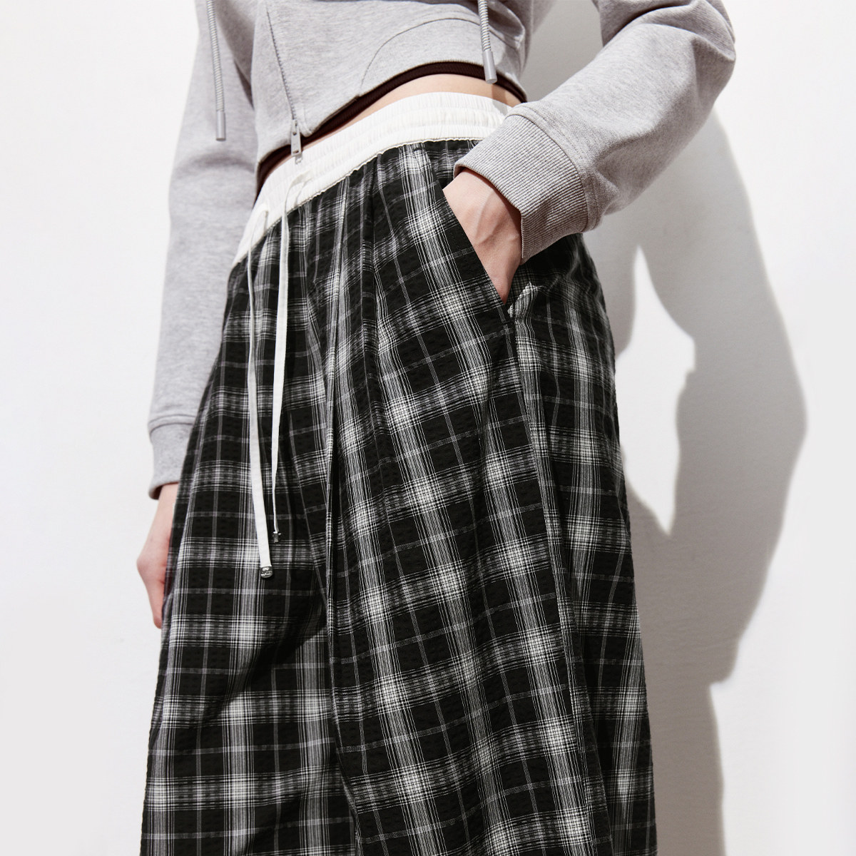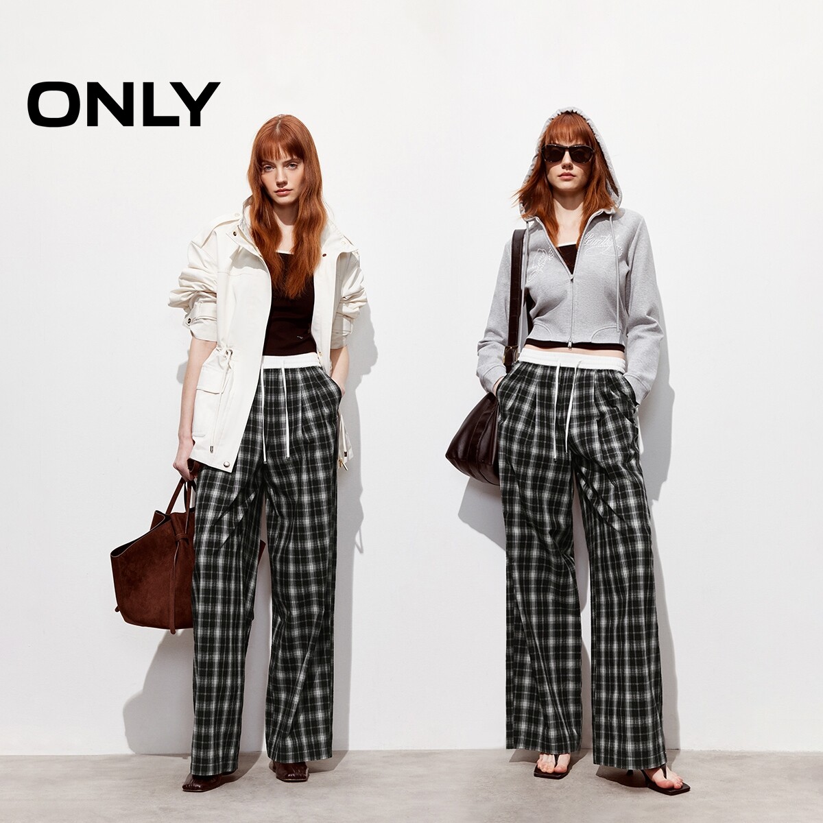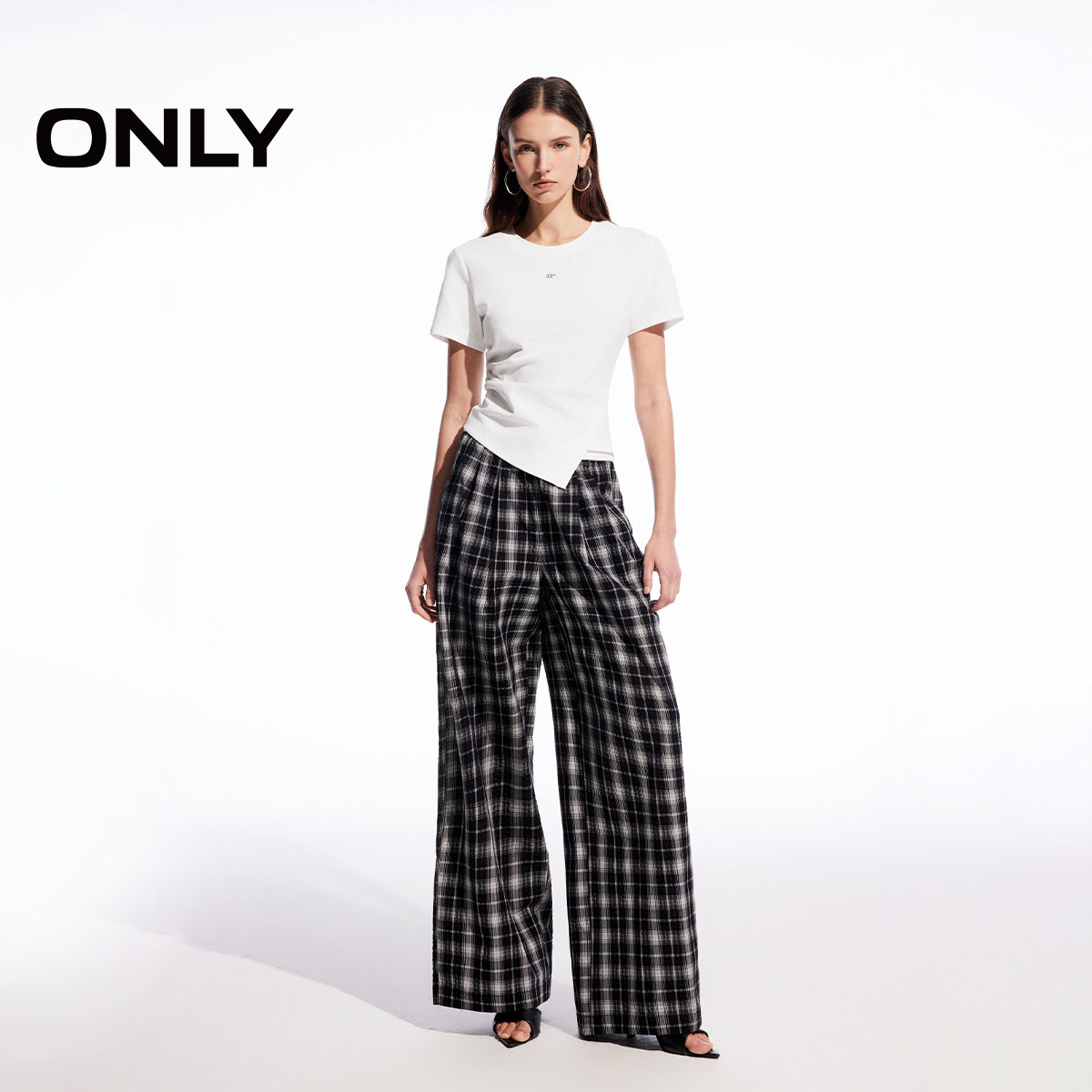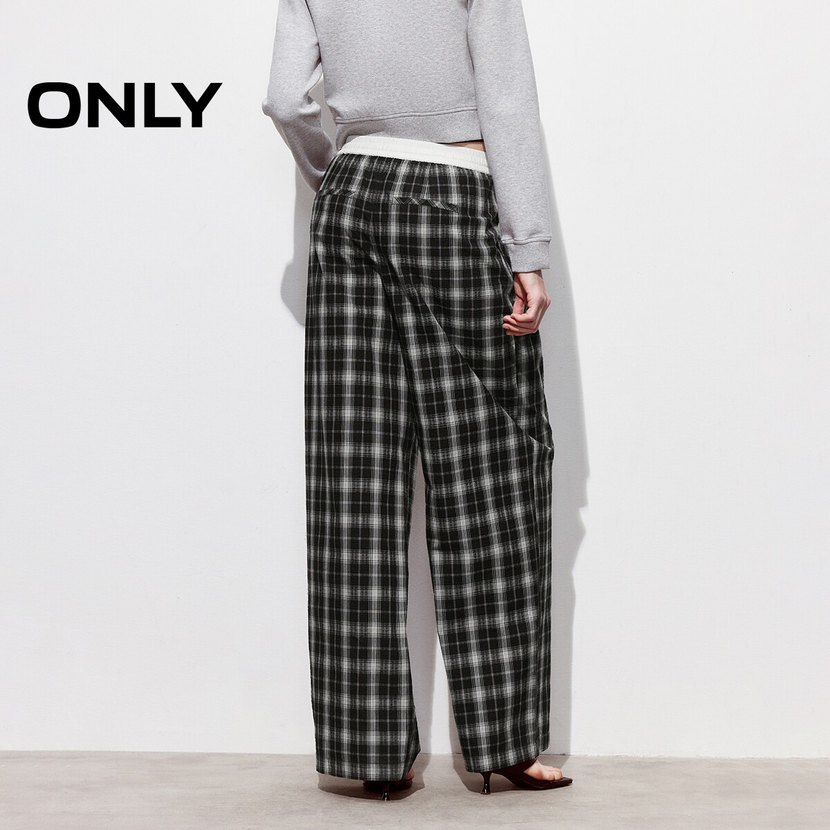 ONLY2026春季新款松弛感纯棉松紧腰头宽松阔腿黑白格纹休闲裤女