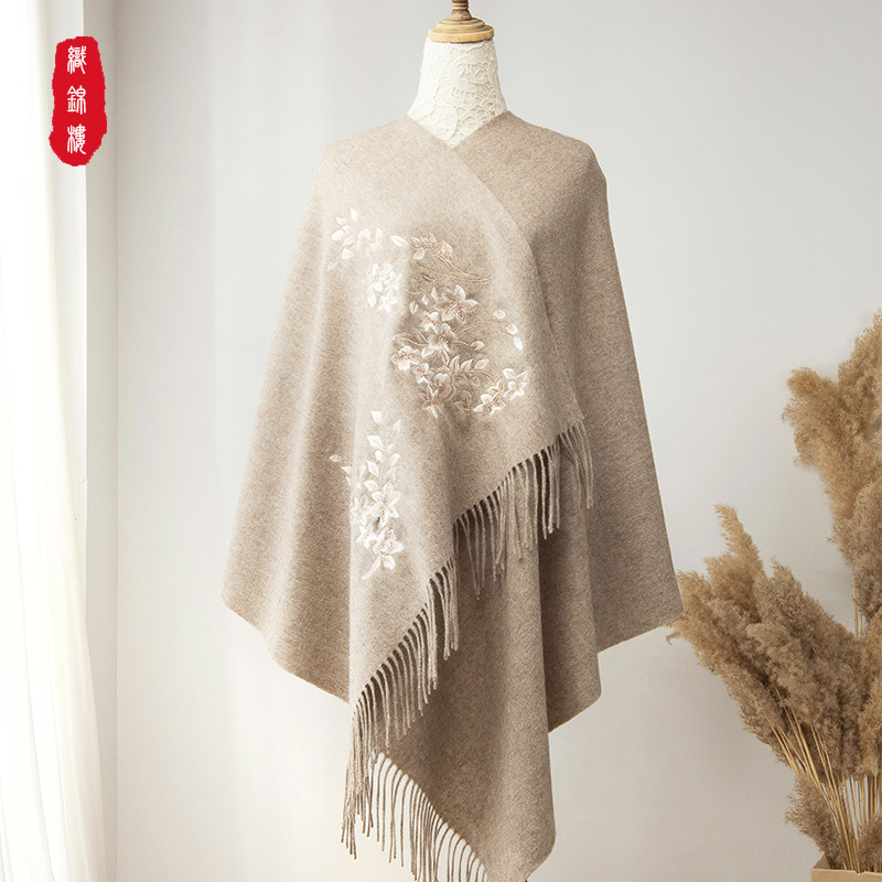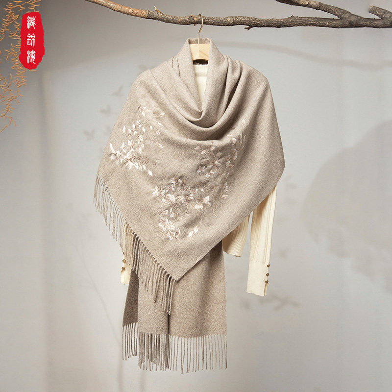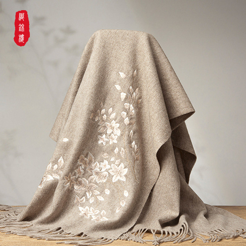 【新年礼物】织锦楼100%羊毛刺绣围巾女披肩送长辈礼盒节日礼物