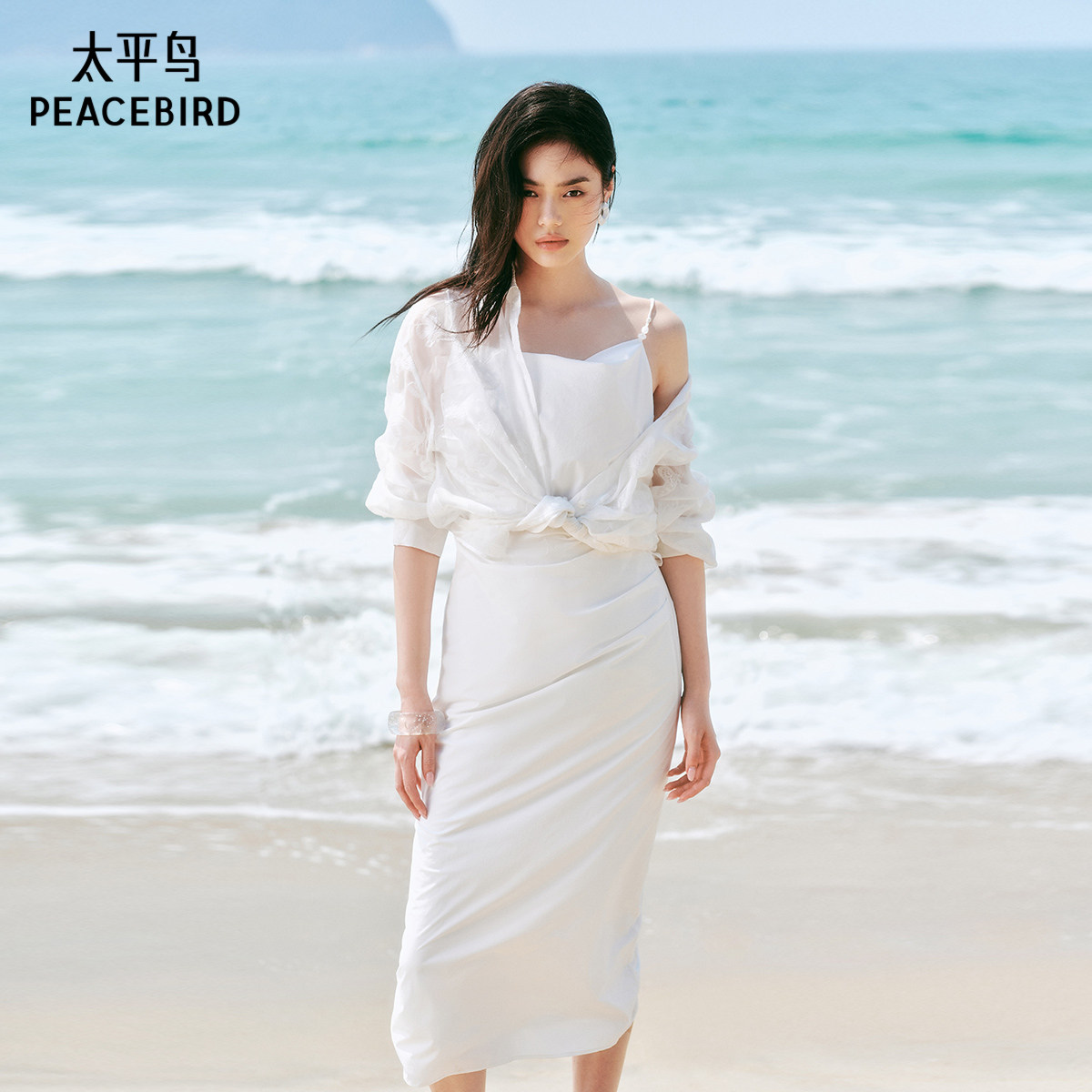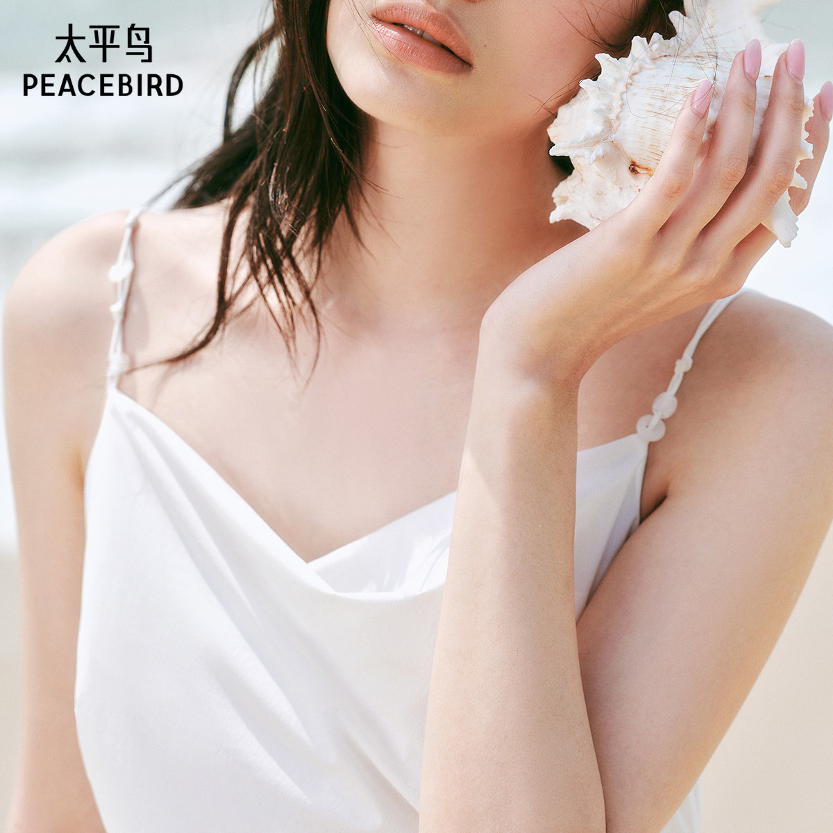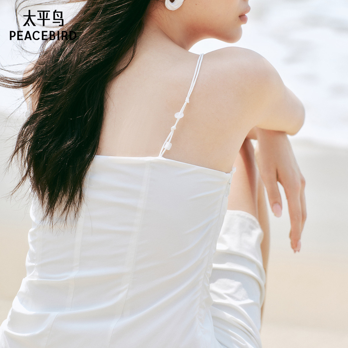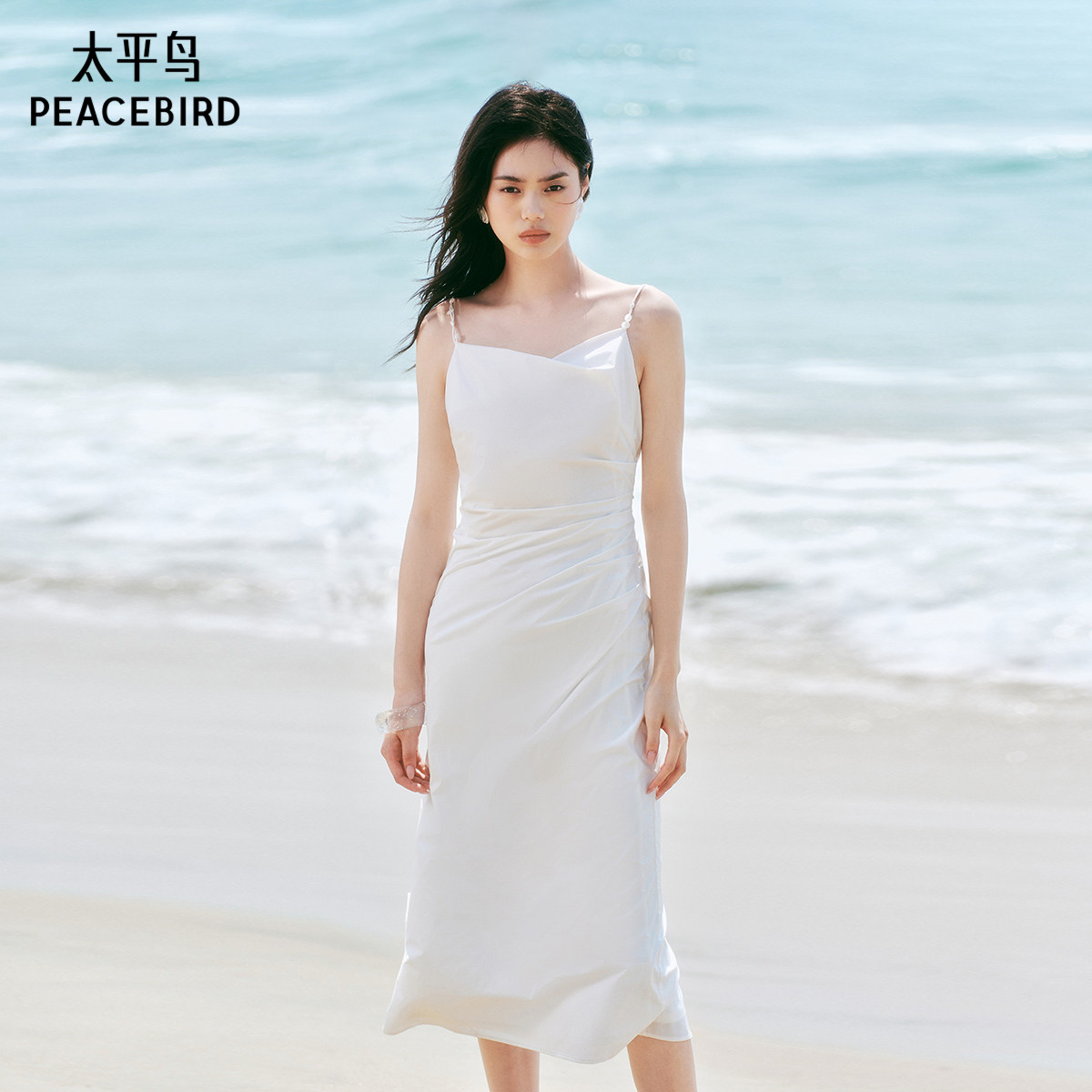 太平鸟收腰捏褶吊带连衣裙女2025夏新款白色牛奶丝长裙子气质法式