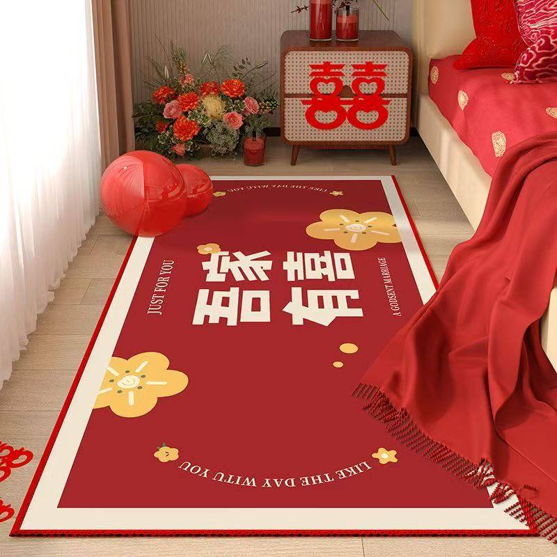 新款结婚床边毯卧室地垫红色喜庆床头地毯婚房布置喜字喜庆高级感