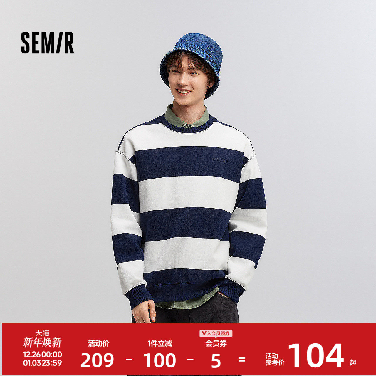 森马斯沃夫小狗联名卫衣男春季简洁字母绣花条纹情侣宽松圆领上衣