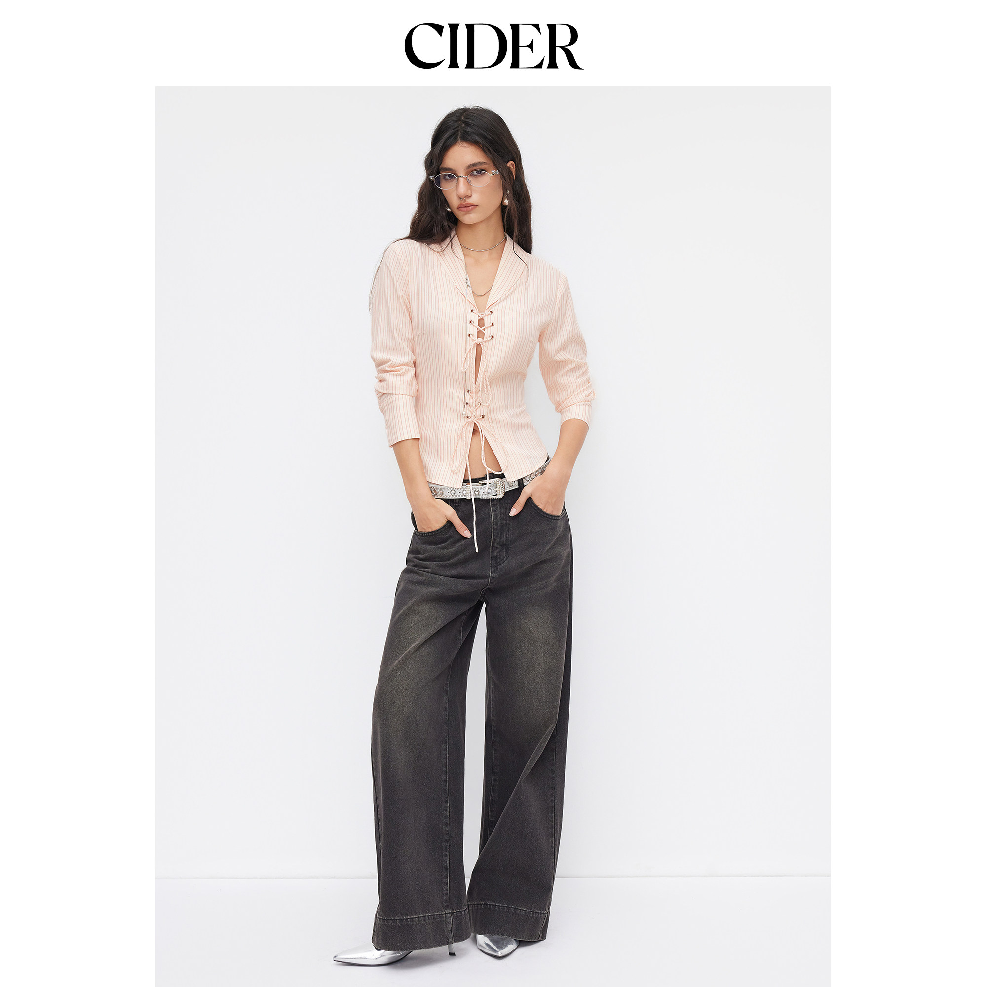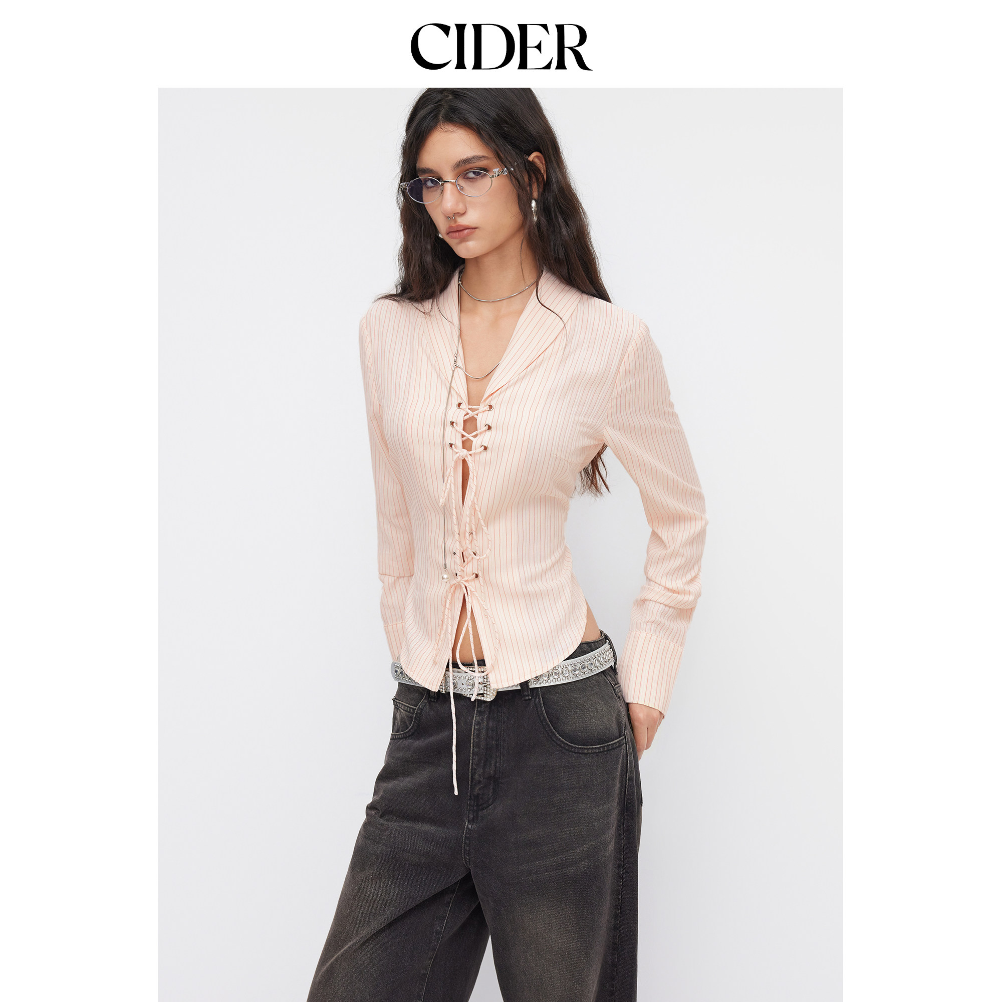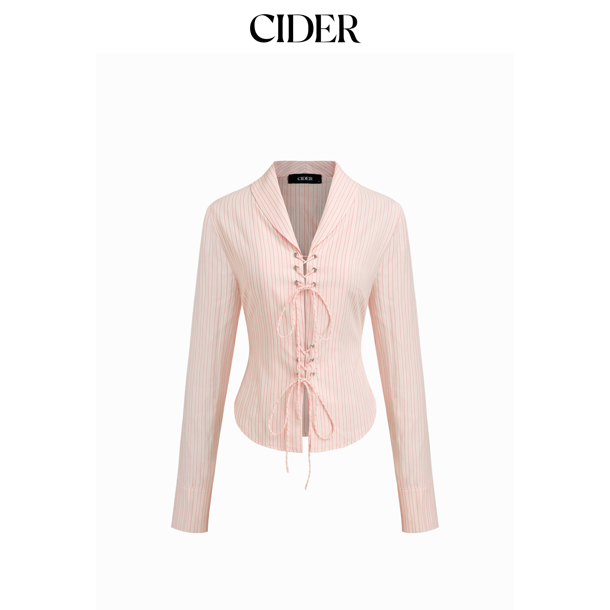 CIDER 春秋新品女装棉质翻领条纹系带长袖上衣114820419