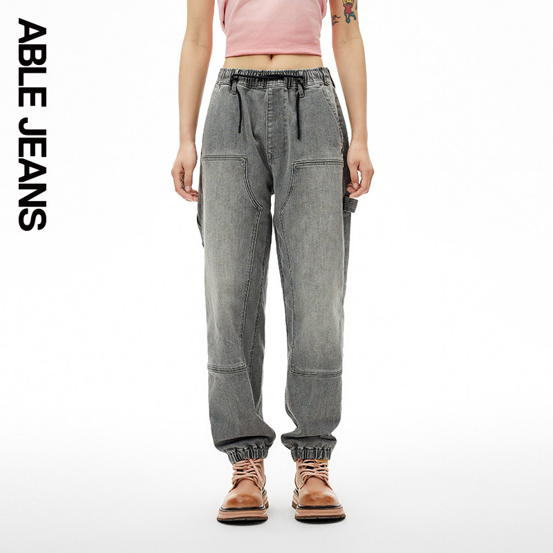 ABLEJEANS 【木匠酷跑运动裤】女士春秋款松紧腰束脚九分牛仔裤